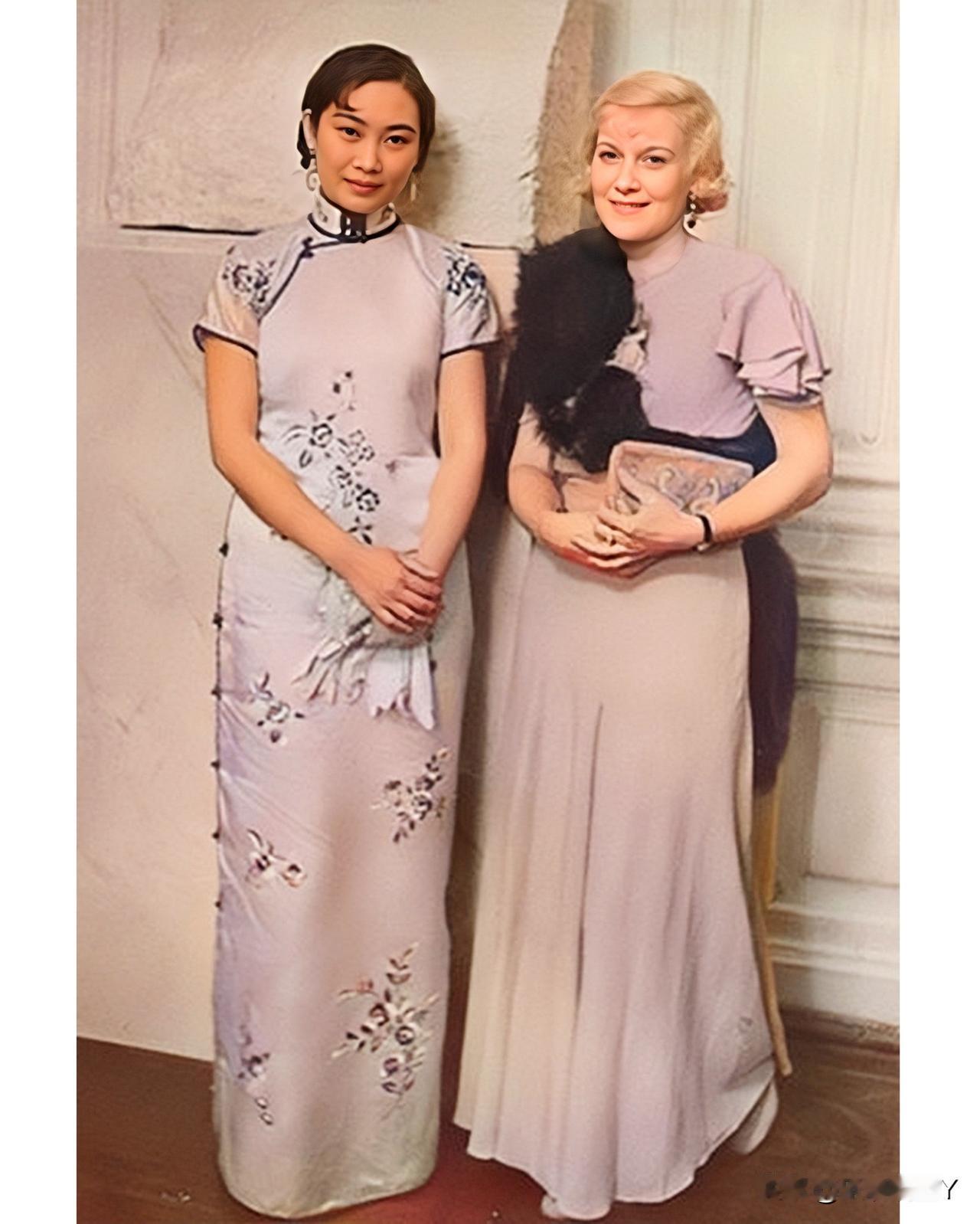 这是胡蝶在莫斯科与苏联电影明星奥格洛娃的一张合影老照片,拍摄于一九三五年。彼时胡蝶二十七岁,身着旗袍,美到极致!
