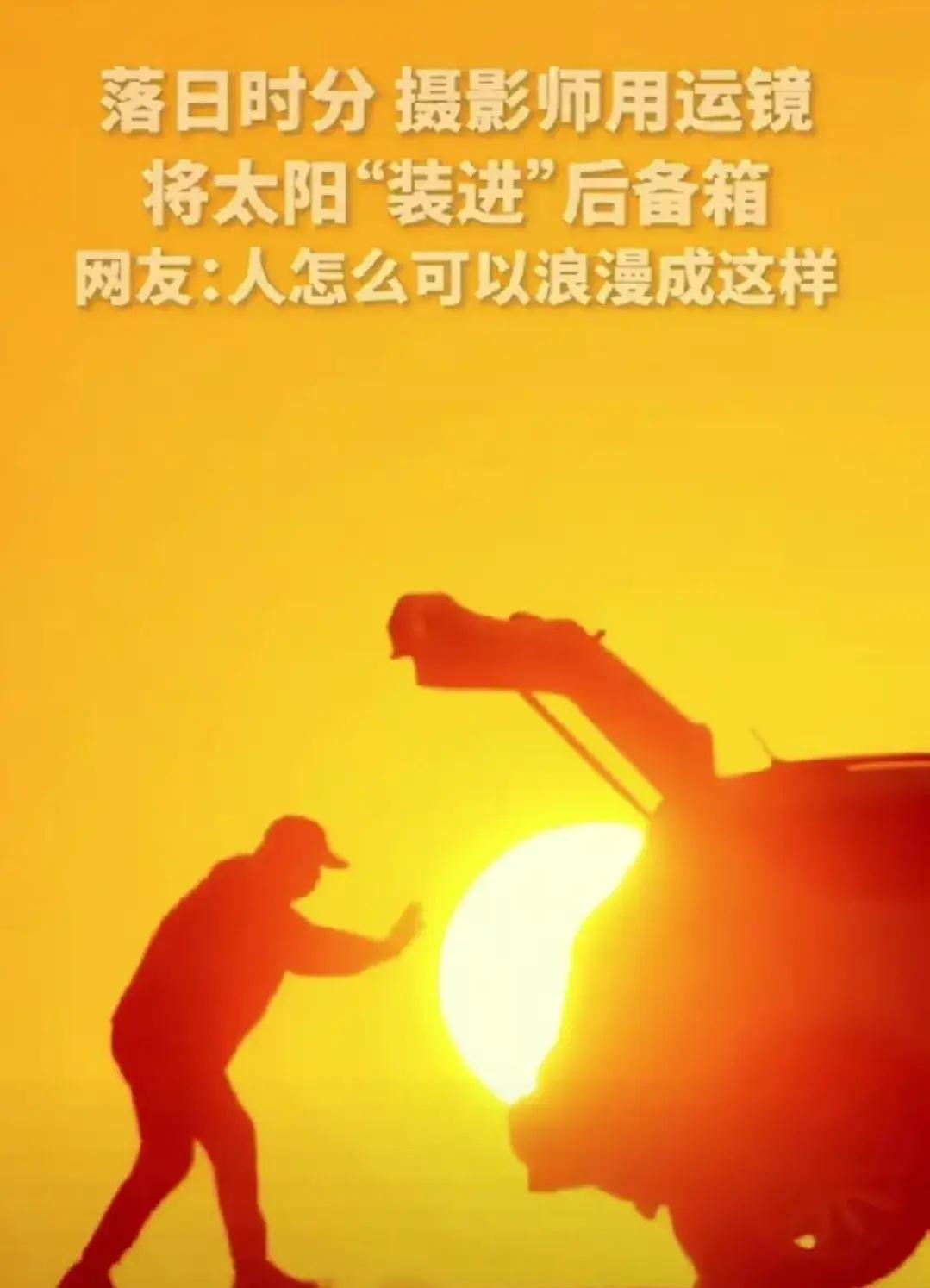 “没想到上人民日报了!”江西,一男子落日时分,开车来到空地上,摄影师一个错位运镜,竟把整轮太阳装进了汽车后备箱,画面美到犯规。网友:你装走了,我用什么? 这话是画面火了之后,当事人在评论区留的,语气里还带着点没缓过来的懵。没人想到,不过是两个普通人趁着下班空当,找了片没遮挡的郊外空地折腾半小时,能让这么多人盯着屏幕笑出声。 当事人小周是个普通上班族,那天加班到傍晚,开车路过城郊的河堤,突然被天边的落日勾住了脚步。橘红色的太阳悬在远处的地平线,像块熔金般往下沉,光线柔和得不像话。他当即给摄影师朋友小陈发消息:“快来!这落日绝了,咱们整个活!”小陈赶过来时,小周已经把车停在了一片开阔的草地上,后备箱敞开着,正对着落日的方向。 “一开始想拿手捧太阳,后来觉得不够特别。”小周后来笑着回忆,两人围着汽车转了好几圈,试了把太阳“放进”车窗、引擎盖,都觉得差点意思。直到小陈往后退了二十多米,喊了声“开后备箱!”小周应声掀起后备箱盖,镜头里,那轮圆滚滚的落日刚好嵌进黑色SUV的后备箱,边缘轮廓严丝合缝,像特意定制的“太阳礼盒”,连后备箱里的备用轮胎都染上了一层暖光。 “成了!太会玩了!”小陈激动地喊出声,手指飞快按下快门,还拍了段15秒的短视频。视频里,小周慢慢合上后备箱,仿佛真的把太阳“打包带走”,背景里的晚霞染红了半边天,微风拂过草地的沙沙声都清晰可闻。两人当时只觉得好玩,随手发在了短视频平台,没料到第二天一睁眼,消息99+,视频点赞量破了百万,连人民日报都转发了,配文“生活需要一点创意,把美好装进口袋”。 更有意思的是网友的评论区,简直成了大型“脑洞现场”。有人调侃:“快打开后备箱看看,是不是烫屁股?”“建议申报非遗,这是‘落日收纳术’吧!”还有人跟风模仿,有把月亮装进保温杯的,有把城市地标“塞进”口袋的,甚至有农民大哥拍了段“把稻田里的金光装进竹篮”的视频,很快也火了。小周笑着回复网友:“下次拍摄给你们留一半太阳,绝不独吞!”这份接地气的互动,让更多人觉得“原来创意这么简单”。 其实啊,这波爆火根本不是偶然。某短视频平台数据显示,今年以来“创意生活摄影”相关话题播放量已经突破5.8亿次,其中“错位摄影”子话题播放量超2.3亿次。大家看够了精致的网红打卡照,反而对这种“零成本、高创意”的生活记录更买账。小陈说:“我没什么专业设备,就是个普通摄影爱好者,拍的时候就想着怎么把日常变得有趣,没想到戳中了这么多人。” 这种“把美好装进容器”的创意,早有先例。去年火遍全网的“手捧月亮”系列,就是摄影师利用错位,让模特的手掌刚好托住天边的圆月;还有网友在故宫角楼前,把角楼的飞檐“放进”茶杯里,画面同样惊艳。摄影博主@光影杂货铺 说:“创意摄影的核心从不是昂贵的相机,而是发现美的眼睛——太阳天天落,但有人能想到把它装进后备箱,这就是生活给有心人的惊喜。” 小周后来在采访里说:“平时上班忙得脚不沾地,那天就是想暂时逃离格子间,看看日落吹吹风。”这话戳中了太多打工人的心声。现代人的生活节奏太快,忙着赶地铁、赶项目、赶deadline,往往忽略了身边的小美好。而这张“后备箱装太阳”的照片,就像一剂温柔的解药,告诉大家:生活不用总是紧绷着,花半小时找片空地,用手机就能记录下治愈的瞬间。 人民日报的转发,更是让这份美好有了更深远的意义。它不是在推崇“网红打卡”,而是在传递一种生活态度——平凡的日子里,也能靠创意和热爱制造惊喜。小周和小陈的初衷很简单,就是记录生活里的小确幸,可正是这份不刻意的真诚,让越来越多人意识到:美好从不是远方的风景,而是藏在下班路上的落日、随手可及的创意里。 生活就像这后备箱,看似普通,却能装下意想不到的美好。不需要复杂的策划,不需要专业的技能,只要我们愿意慢下来,带着一点好奇心去观察、去尝试,就能在平凡里挖出属于自己的“小浪漫”。 各位读者你们怎么看?欢迎在评论区讨论。
