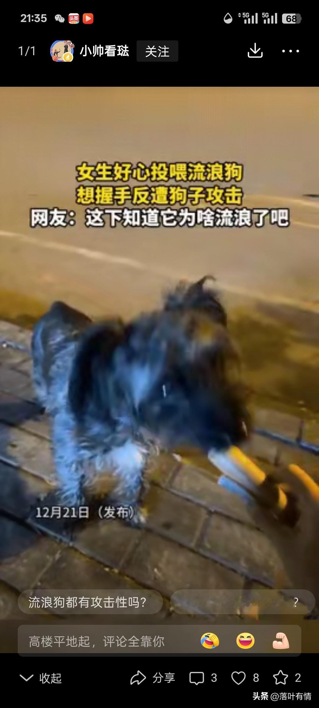 圣母心泛滥可不好, 一位女生在大街上看到一只流浪狗, 出于好心她就给流浪狗喂骨头, 喂了一会后, 就圣母心泛滥了, 觉得吃人嘴短,拿人手软, 自己摸一摸流浪狗, 也是应该的, 殊不知流浪狗的危险, 当她将手靠近后, 想要和流浪狗握手, 流浪狗愣了2秒, 随后牙齿露了出来, 猛然的扑了上去, 发出了撕咬的声音, 幸亏女生躲的快, 要不然就被咬伤了手指, 网友表示这回知道为啥流浪了吧, 流浪狗就是非常难驯, 由于原主人将它遗弃, 小狗已经对人产生了不信任, 不是你喂一顿食物就可以亲近的, 这位女生也应该长教训了, 大家对于该女生这样的行为怎么看? 流浪狗 助养流浪狗 爱心救狗 流浪猫狗救援 狗车救助