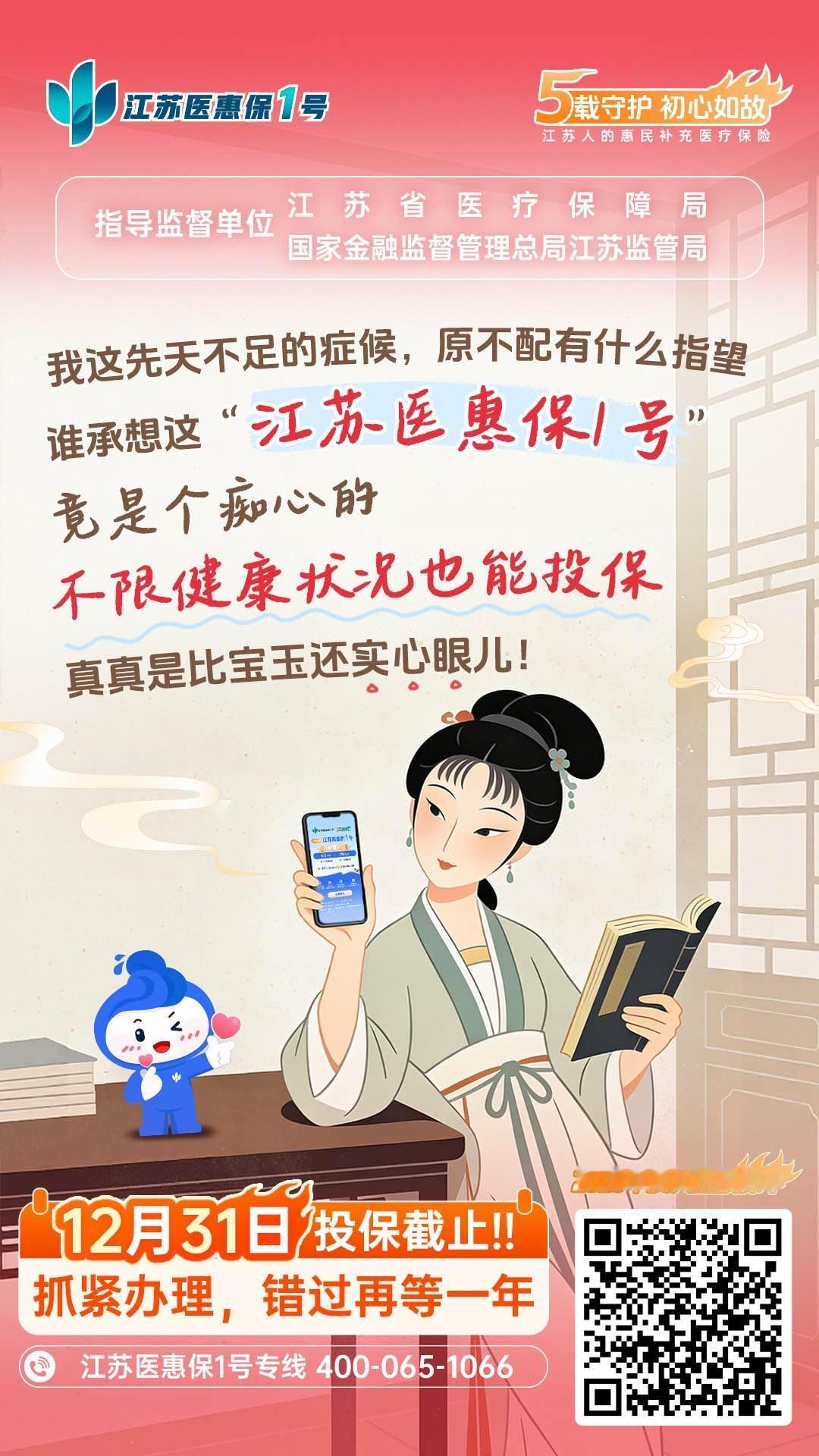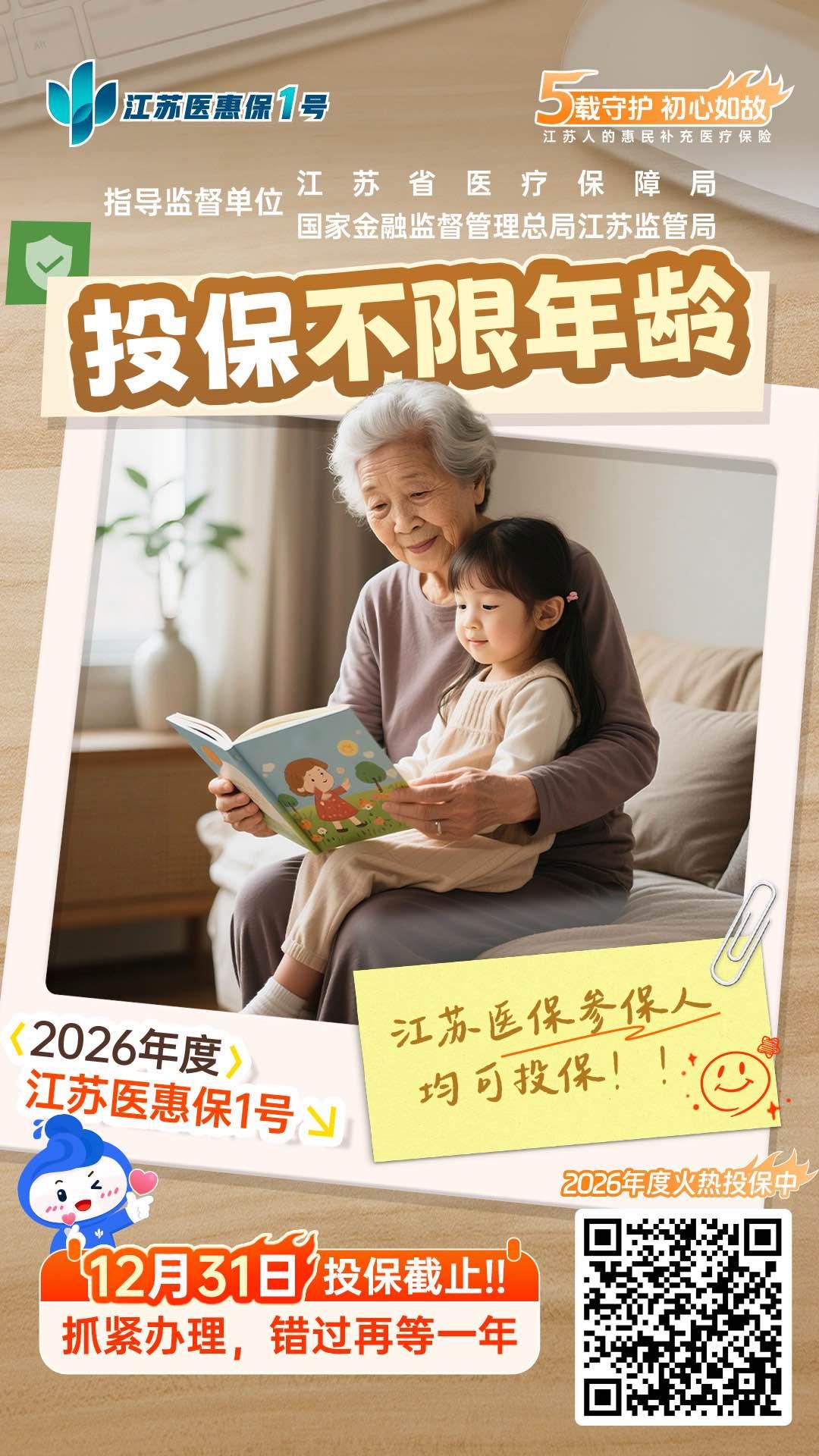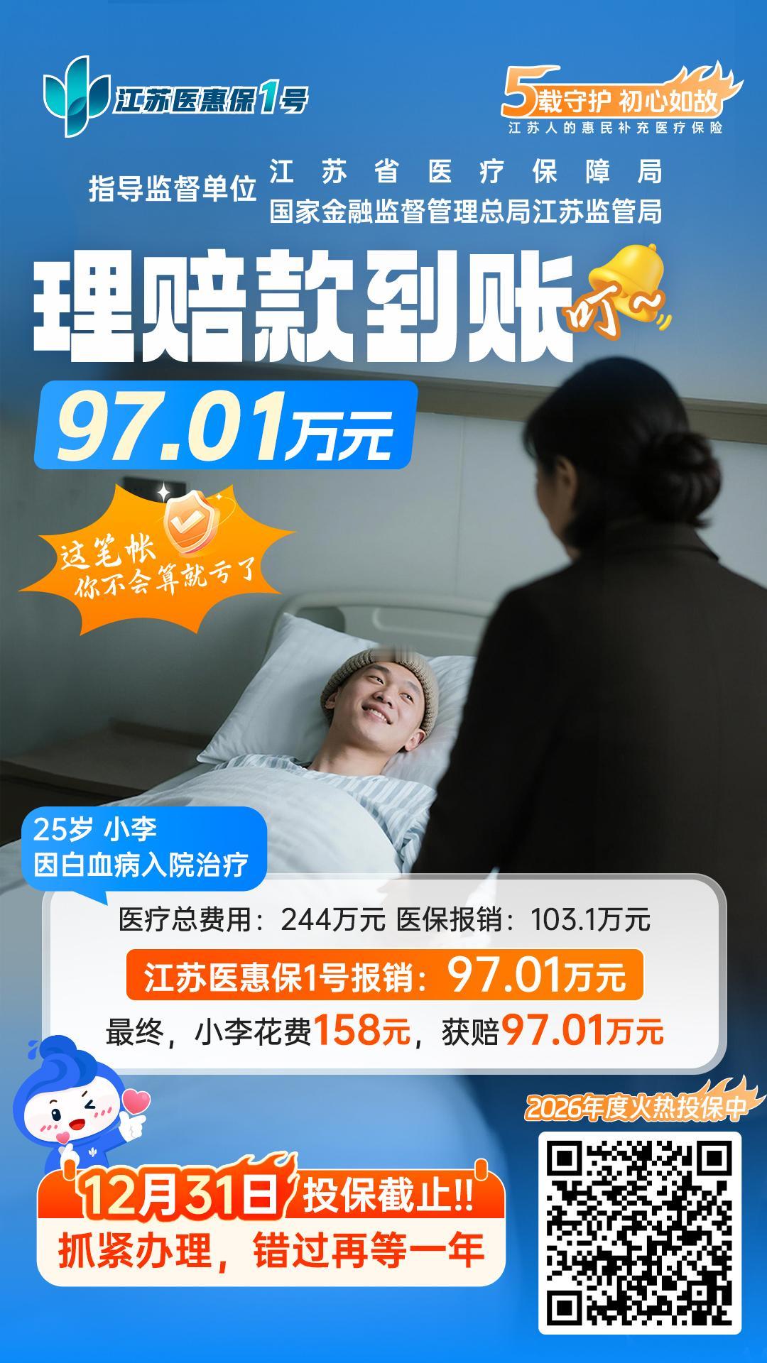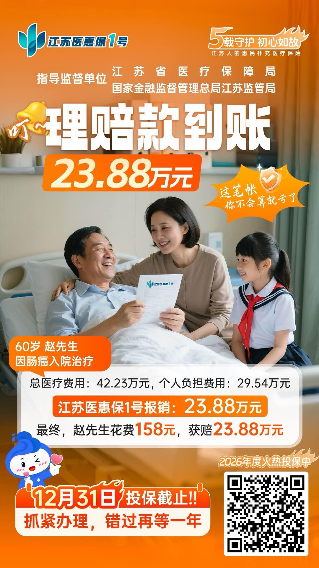 今天想和大家聊一个沉重但必须直面的话题:当大病突袭,我们的家庭财务能扛得住吗? 医保是基础,但面对大病,自费药、特效药、高值耗材往往才是压垮家庭的最后一根稻草。而“江苏医惠保1号”,就是那个在医保之外,为你兜底的“救命恩人”。 💡 真实案例:它真的能救命 还记得2025年那个理赔案例吗?S先生因病在三甲医院治疗,总费用173万,个人负担高达48.6万。幸运的是,他投保了“江苏医惠保1号(升级版)”。 责任一(医保内自付): 赔付约7.99万元 责任二(医保外自费): 赔付约17.62万元 责任三(重疾再保障): 赔付约6.44万元 责任五(质子重离子): 赔付约19.46万元 总计获赔:51.51万元! 这笔钱,不仅覆盖了个人负担的费用,还为后续康复提供了保障。 🚨 2026年度参保提醒:错过再等一年! 目前,2026年度“江苏医惠保1号”正在火热参保中,截止时间是2025年12月31日。一旦错过,哪怕你是江苏医保参保人,也得再等一年! 为什么我强烈建议你(和家人)现在就参保? 政府指导,真惠民:由江苏省医保局指导,9家知名保险公司(如紫金、人保、平安等)共同承保,累计赔付金额已超27亿元,单人最高赔付过百万,这不是商业噱头,是政府的民生工程。 门槛极低,带病可保:不限年龄(刚出生的宝宝到百岁老人都能保)、不限职业、不限户籍,最关键的是不限健康状况。既往症人群也可以承保、可以赔付,赔付比例仅比非既往病史人员低15%,这在商业保险中是绝无仅有的。 医保个账全家用:如果你是江苏职工医保,不用花现金!直接用医保卡里的钱,就能给配偶、父母、子女缴费。一人缴费,惠及全家,让沉睡的医保余额发挥最大价值。 🛡️ 两款方案怎么选? 【基础版】158元/年:适合预算有限的朋友,重点覆盖大病常规治疗,最高保障320万。 【升级版】258元/年:强烈推荐有肿瘤风险或追求高保障的家庭。它在基础版上增加了质子重离子和CAR-T药品保障,这两项往往是癌症治疗的“核武器”,0元免赔额,最高保障400万。 写在最后: 疾病从不和我们打招呼,但保障可以提前准备。别让一场大病,耗尽半生积蓄。如果你关心家人,现在就打开微信搜索“江苏医惠保1号”公众号,用一顿饭的钱,换一家人体面的医疗尊严。 参保时间:2025年9月23日 - 2025年12月31日 保障时间:2026年1月1日 - 2026年12月31日