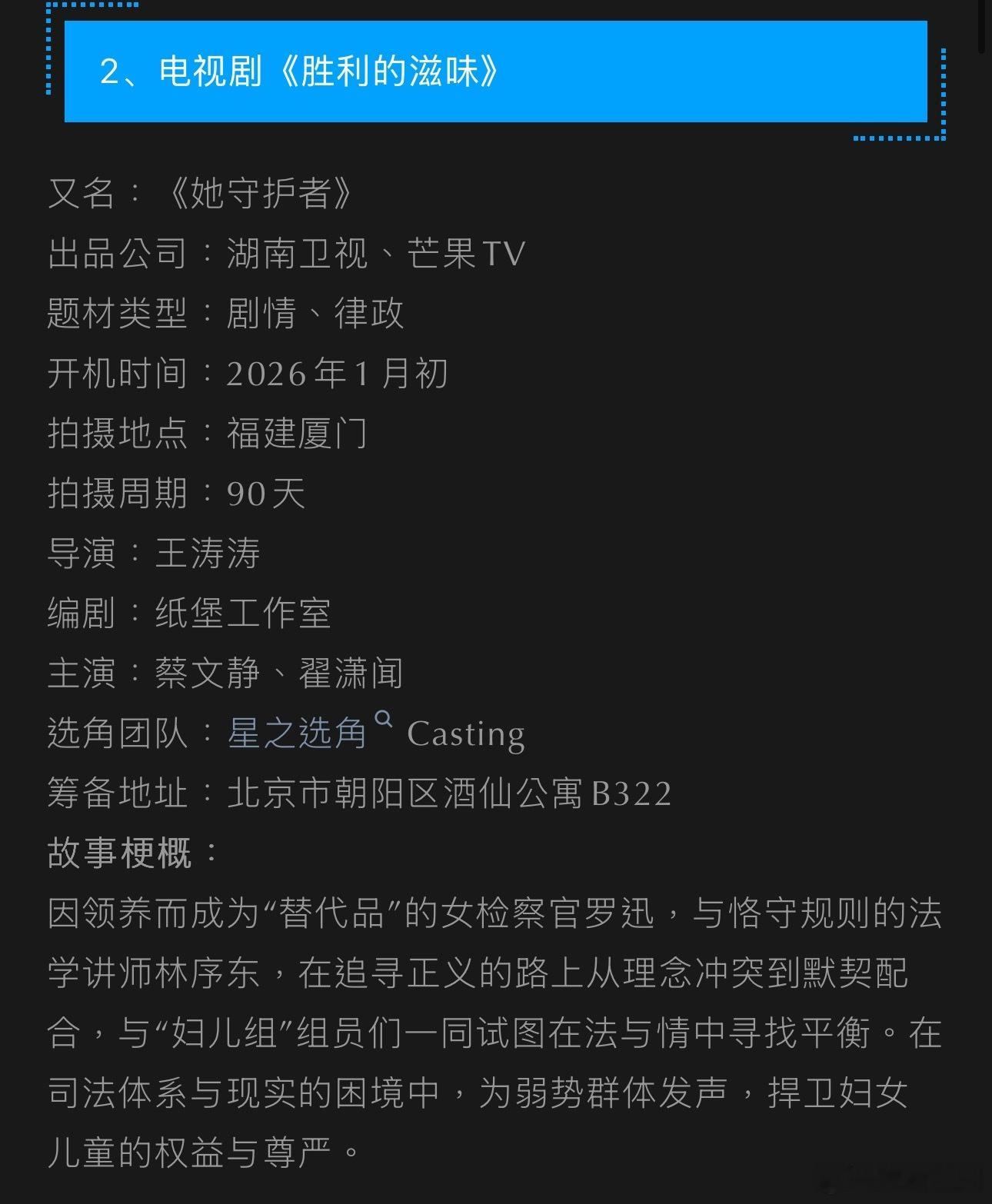 芒果🥭电视剧《胜利的滋味》(《她守护者》)要开机了主演:蔡文静、翟潇闻导演:王涛涛编剧:纸堡工作室题材类型:剧情、律政开机时间:2026年1月初
