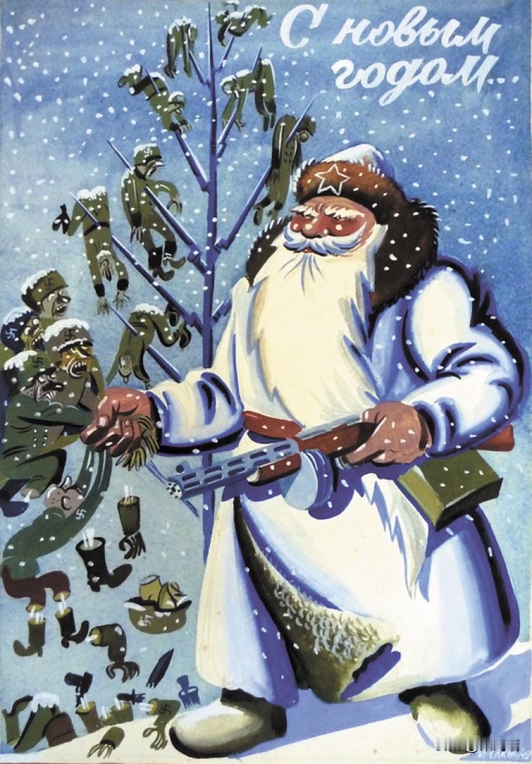 这是一张著名的苏联二战宣传海报(或新年贺卡),创作于1942年,由画家伊万·埃尔金(Ivan Elkin)设计。 海报信息 标题: 海报顶部的俄语文字“С новым годом!”意为“新年快乐!”。 核心形象: 主要人物是严寒老人(Ded Moroz),是斯拉夫神话中的送礼者,相当于俄罗斯的圣诞老人。在苏联时期,他曾一度被禁止,后来被重新塑造成世俗的新年形象。 宣传主题: 这幅画旨在鼓舞士气。严寒老人没有带来传统礼物,而是手持冲锋枪,将象征着纳粹士兵的形象(带有纳粹万字符)挂在圣诞树上,或将他们(穿着灰色军服、戴着钢盔)作为战利品扔在树下。 背景: 这类宣传品在二战期间的苏德战争(苏方称为“伟大卫国战争”)中被大量制作,用于激发苏联人民的斗志和对敌人的仇恨,强调对侵略者的抵抗。