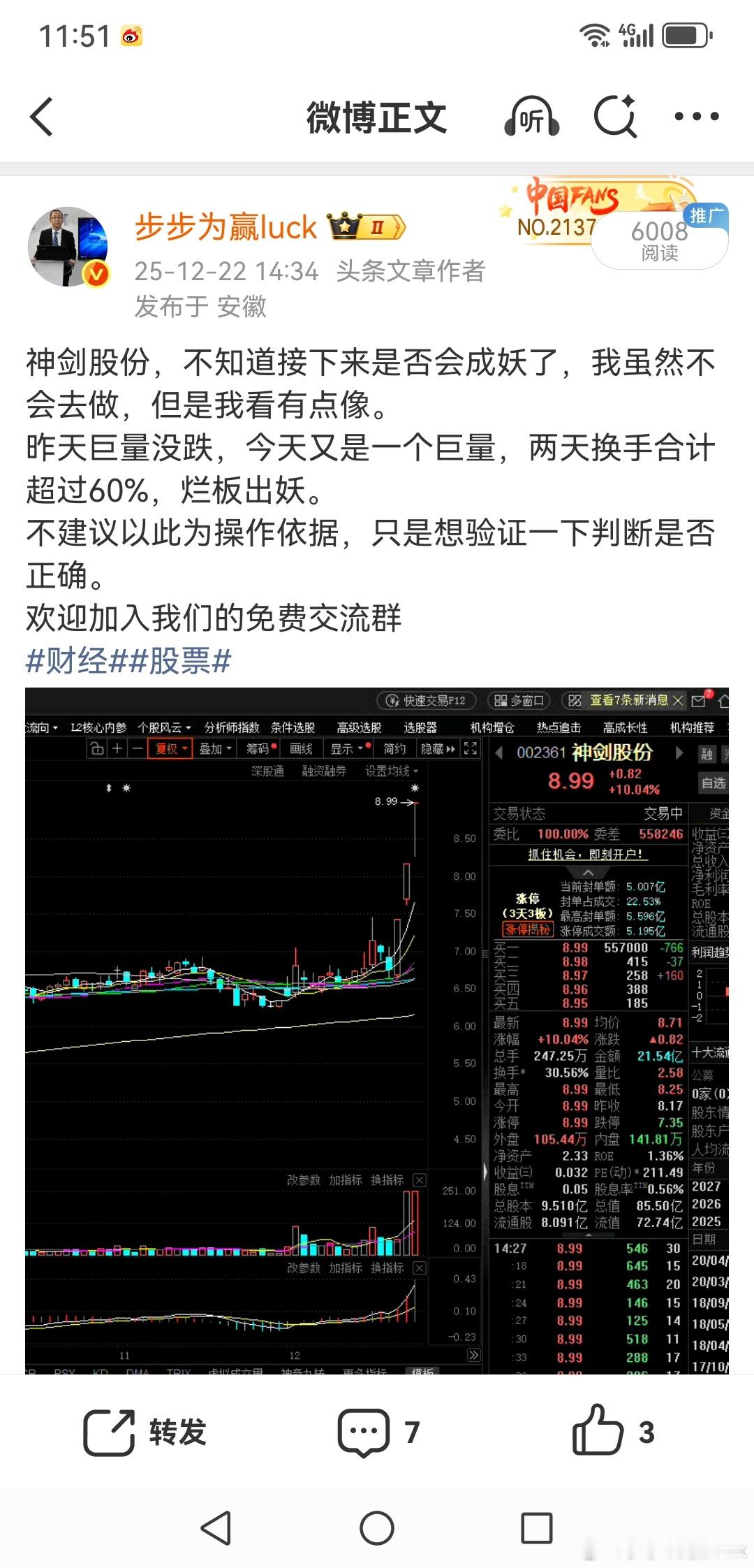 神剑股份,虽然我没有去做,但是盘感、逻辑还是正确的。欢迎加入我们的免费交流群。财经股票