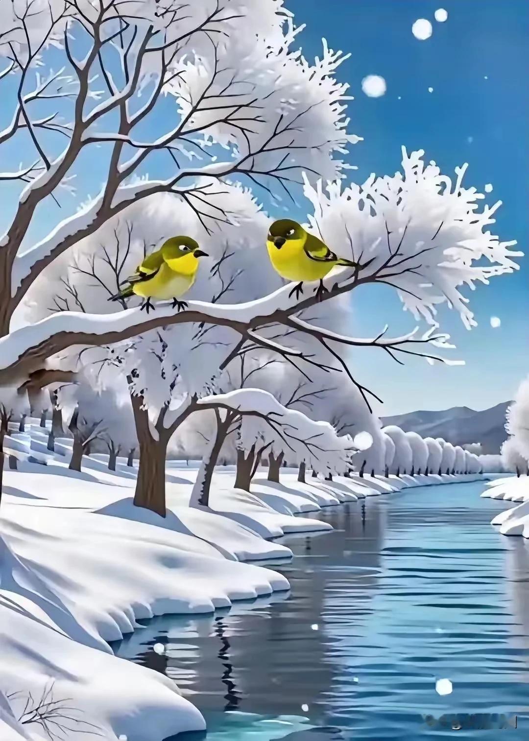 雪花飘飘。景色宜人 冬日暖阳,两只小鸟 雪枝欢唱,静谧河面 倒映它们,快乐影子