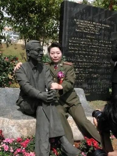 1997年,陈景润的妻子坐在丈夫的雕塑旁,紧紧搂住“丈夫”的肩膀,留下了这张感人