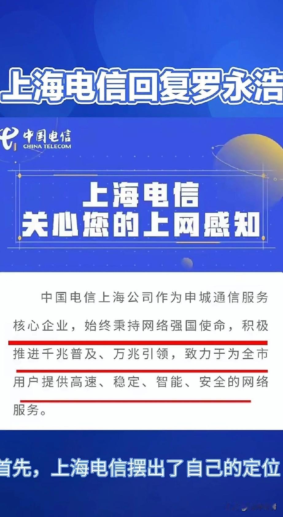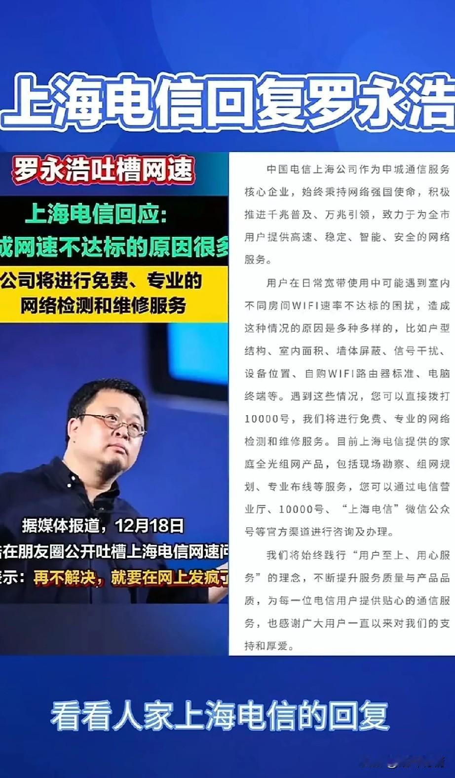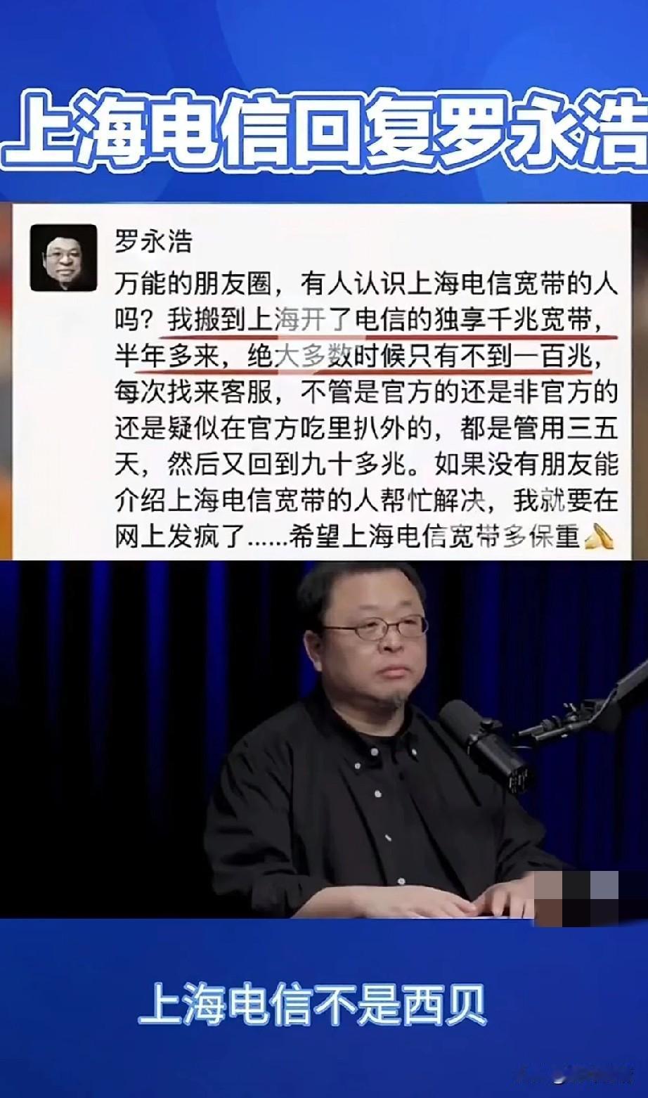 罗永浩被某信网速很不满, 称自己在上海开的千兆宽带, 网速不足100兆, 这可把他气坏了, 多次致电客服, 均无法得到解决, 于是直接在网上声讨, 这是可是让某信出名了, 因为它自带流量, 这事迅速登上热搜, 结果没到两三天, 就有工作人员主动上门解决, 看来名人说话真的管用, 当一个公司只为名人服务, 而对于普通老百姓不闻不问, 那就是非常危险的信号, 相信还有很多像郭永浩一样, 网速不达标的客户, 他们的问题该谁解决? 有人去解决吗? 为什么号称千兆的网速? 实际测速居然还不足百兆, 这不是妥妥的欺骗消费者吗? 不能因为是大公司就可以这样做, 大家对于罗永浩吐槽自己千兆宽带不足百兆这事怎么看? 罗永浩 中国电信 千兆宽带 网速真相 网速吐槽