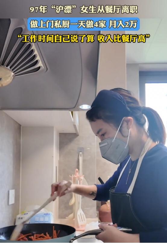 打工人羡慕!上海一28岁女生为了赚大钱,竟然从高档餐厅辞职,做上门私厨,专门帮那些不想做饭的家庭,以此获取报酬。她每天去4个家庭,耗时约8小时,128元做三道菜,一个月收入能达到15000到20000。女生坦言:“收入比之前高,时间自由,自己挺满意的。”   “我有手艺,又年轻,当然要趁现在多赚点!”近日,上海28岁女生小李(化名)的这番话,引发不少年轻人的关注。这位此前任职于高档餐厅的沪漂女生,辞职改做上门私厨后,竟然实现了职业与收入的双重突破。   据了解,小李此前在静安区一家高档餐厅做助理,虽有稳定,但工作强度大,每日工作时长超10小时,可月薪仅8000多。   更让她感到受限的是,餐厅严格的标准化烹饪流程,难以发挥个人厨艺特色。一次偶然机会,她发现身边不少上班族、银发族因没时间或没精力做饭,对上门烹饪服务需求迫切,便萌生了做上门私厨的想法。   这个选择可以说是小李的“创业”初尝试。每一次预约,都是一次从零开始的全流程服务:与客户沟通喜好、亲自采购新鲜食材、带着全部家当准时抵达,并在陌生的厨房里迅速进入状态。128元3道菜的定价,是她对自身时间、技能和通勤成本精细计算的结果。   当之前的同事看到小李月入过万的结果时,无不羡慕心动,却忽略了这背后真实的付出。   那看似自由的八小时,实际上被采购、通勤、烹饪和清洁填塞得满满当当。没有团队协作,从洗切到出品所有环节一人承担。更不用说作为自由职业者,需要独自面对健康风险与收入波动的压力。   这份工作的高收入,实质上是将传统职业中,由企业承担的风险与不确定性,全部转移给了个人,并用更高的时薪作为对价。   当然,对于小李来说,她对这个结果是十分满意。即使要面对风险,要一个人掌控全局,但相比于给别人打工时的束手束脚,小李更想要毫无保留的发挥自己的才能。   其实小李的经历并非个例,而是当下“上门经济”崛起的缩影。在很多一线城市,“上门服务”这一职业形态越来越受到追捧,因此催生出来的业务也更加多元化,包括但不限于美甲、美容、按摩等等。这也侧面说明,小李的眼光很长超前。   对于未来发展,小李也有着清晰的规划:考取公共营养师资质,提升专业度,拓展定制营养餐服务;同时也会借助短视频平台积累更多客户。   小李的转型创业,反映了当代年轻人对灵活就业、价值实现的追求,也折射出城市服务消费的多元化升级趋势。如何推动“上门服务”行业的质量与监管标助力,成为值得关注的社会课题。对此你有什么看法?欢迎在评论区留言讨论。   信息来源: 第一眼新闻2025-12-21|97年“沪漂”女生从餐厅离职,做上门私厨一天做四家,月入两万 文|墨海 编辑|史叔