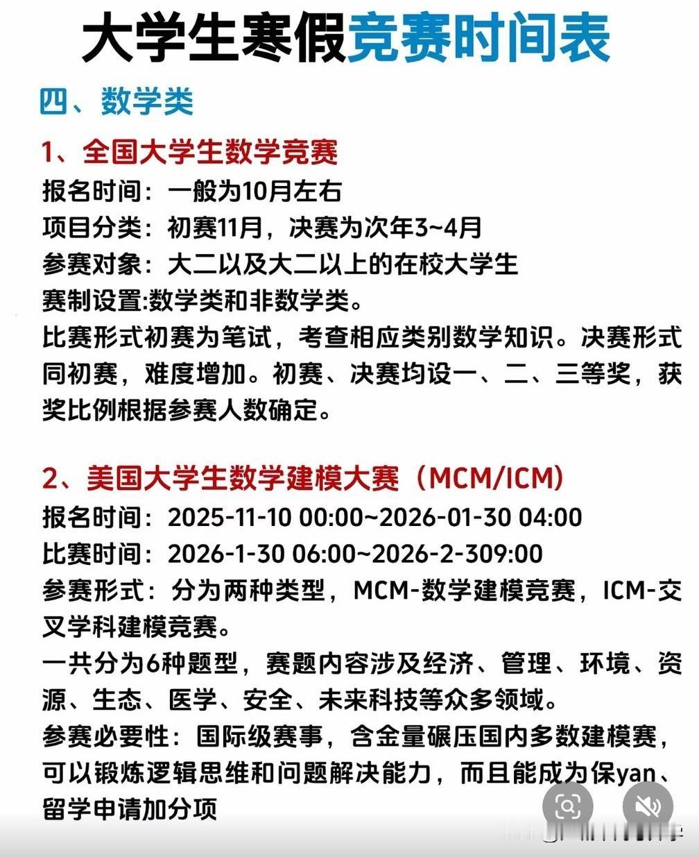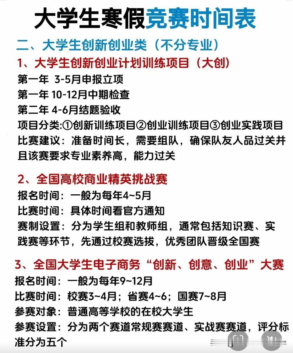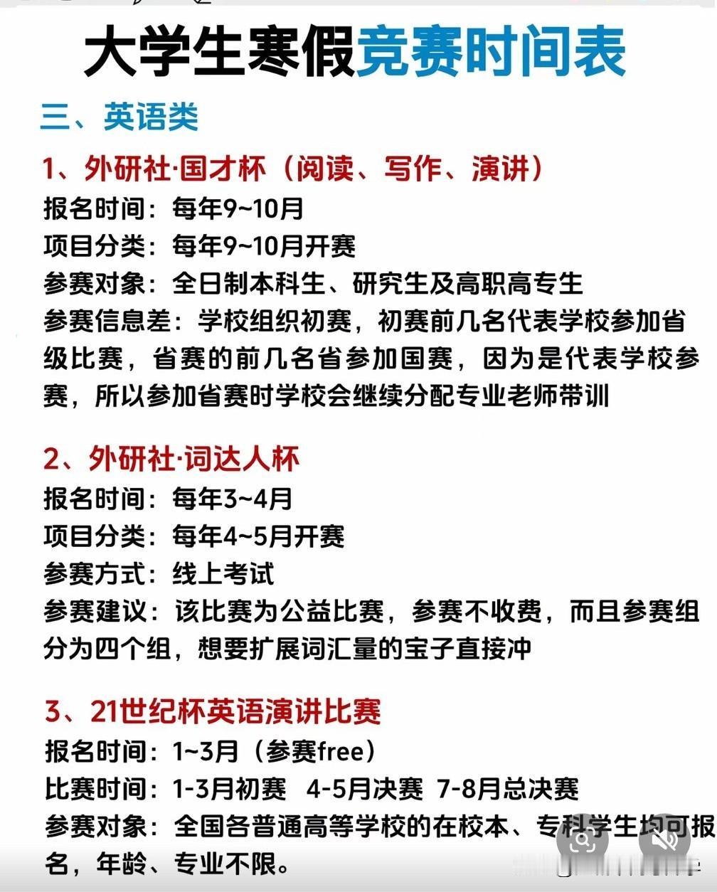 谁说到了大学就不用卷了?大学还更卷, 俗话说不怕同桌是学霸, 就怕学霸过寒暑假, 大学寒假还得准备的竞赛一览表, 竞赛奖项对保研绩点、评奖学金、 拿优秀毕业生都用的着, 大学也不能躺平,也要卷起来! 大学最常见的竞赛分大学生英语竞赛、 挑战杯大学生创业大赛、 互联网+大学生创业大赛、 大学生数学竞赛等, 大家可以根据自己的兴趣和特长来准备, 总之奖项是多多益善。