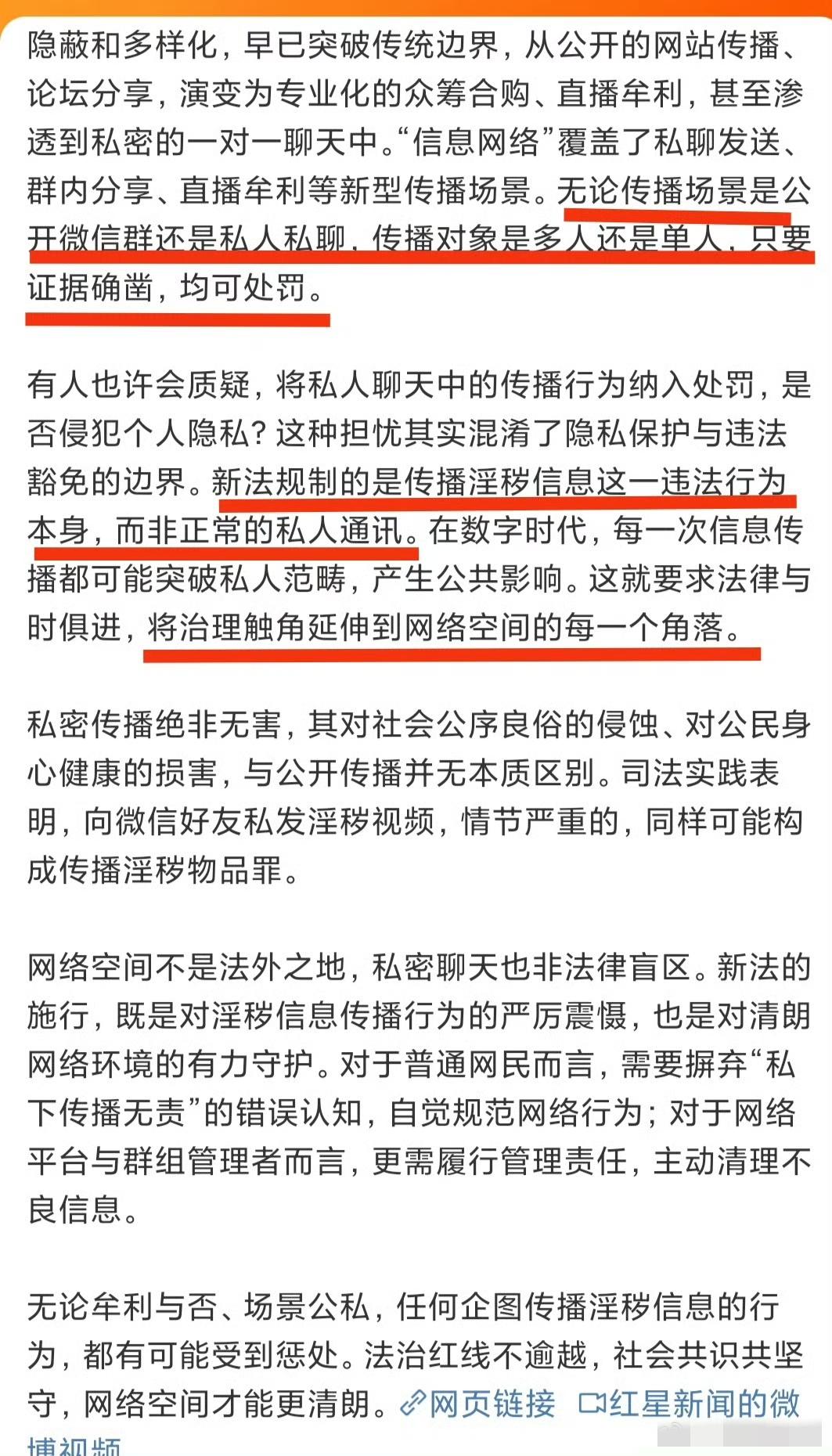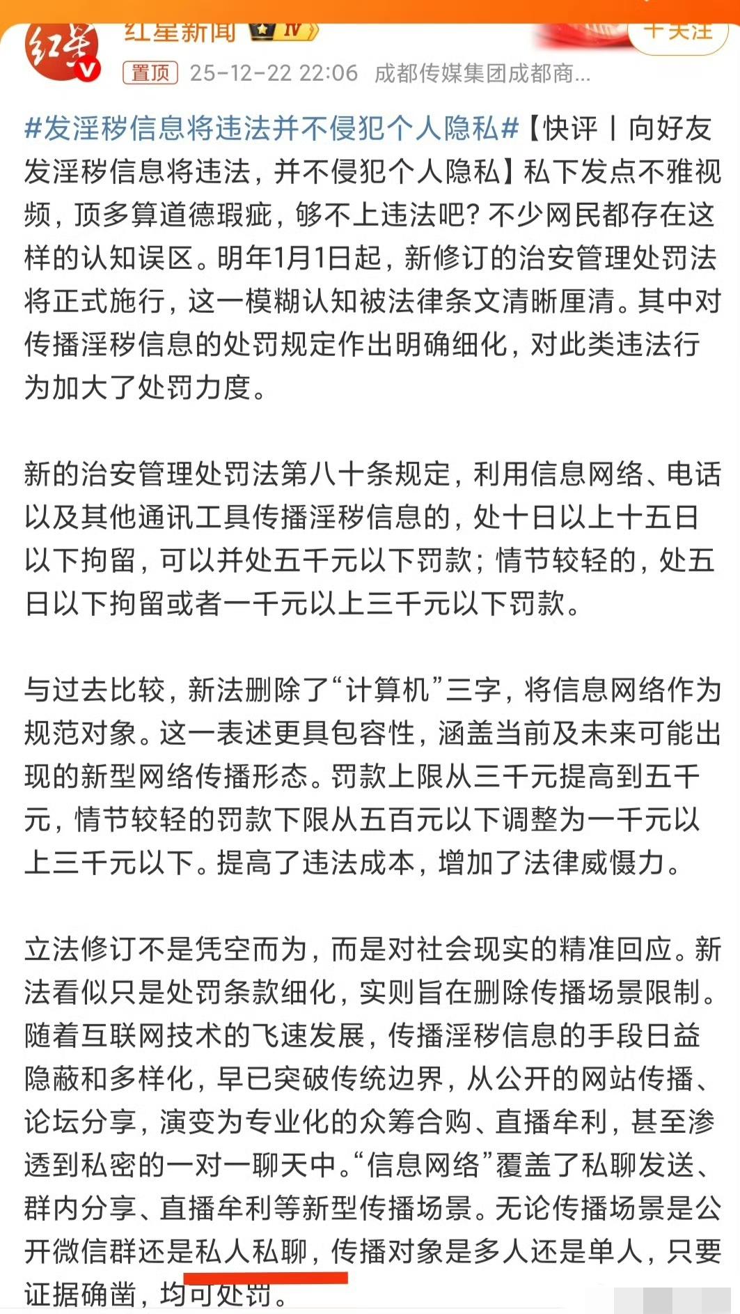 发淫秽信息将违法并不侵犯个人隐私。要害并不在于夫妻与恋人之间私人信息可能构成违法,要害在于是私人信息被全面完整的获取。 按照红星新闻说的,私人私聊只要证据确凿就可以处罚,而且要将治理的触角延伸到网络空间的每一个角落。不禁要问:如果对私人信息不能完整的检查筛选如何确定发了淫秽信息?如果获取这种权限,是不是隐私的其他方面也顺带都被看到了?非法个人信息 低俗违规 淫秽物品牟利