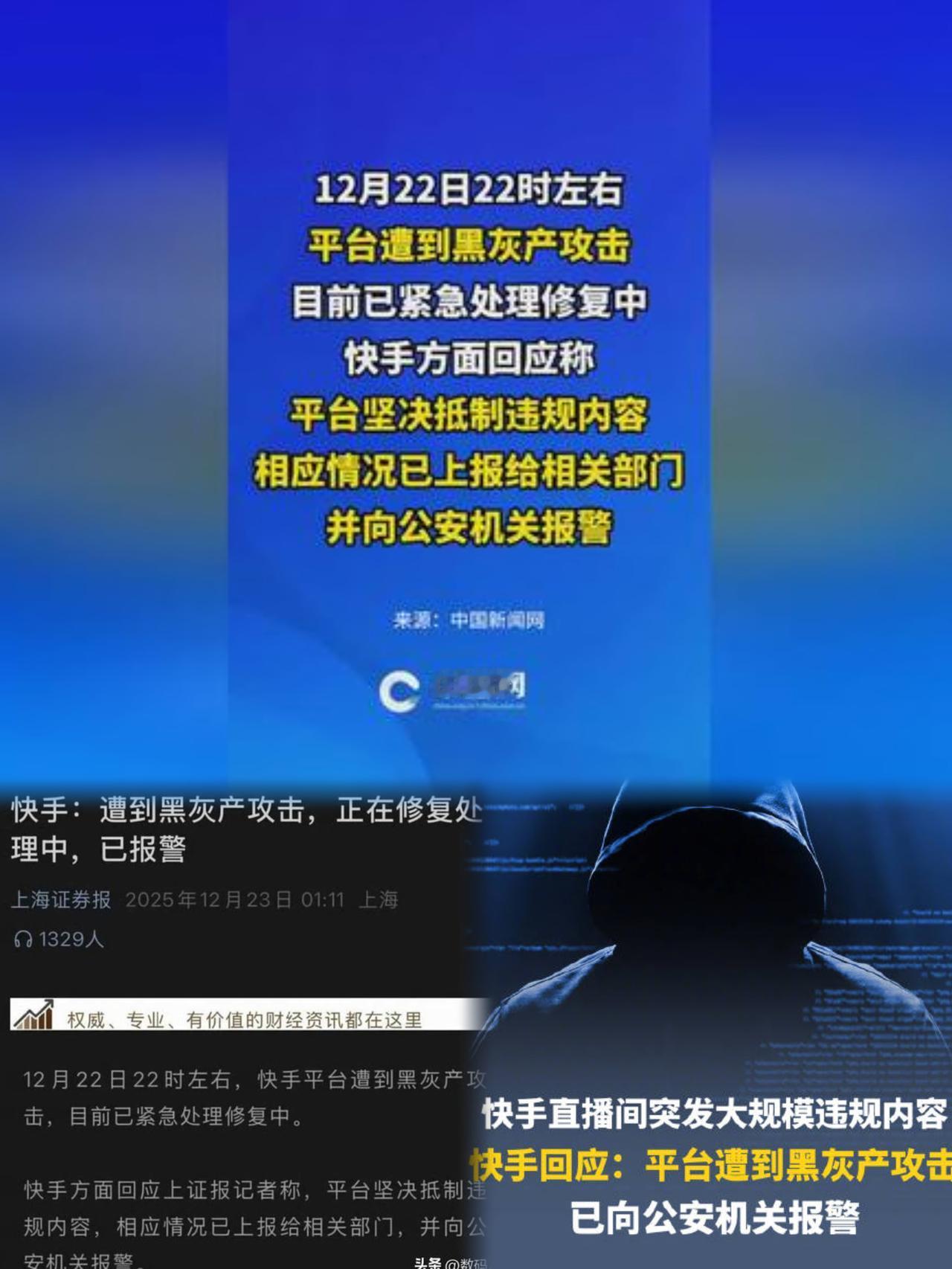 快手深夜遇黑灰产猛攻!1.7万账号作乱,有人被盗刷13万,警方已介入 12月22日深夜快手突发惊魂一幕,黑灰产精准突袭搞事情,不仅刷屏违规内容,还坑惨不少用户,平台连夜处置,真相和安全提醒大家一定要看清! 当晚22点,黑灰产瞅准深夜审核空档下手,先靠接码绕开实名认证,再用脚本批量操控1.7万个僵尸账号集体开播,还拿AI批量生成低俗内容,播完立马切号躲避审核,套路一套接一套。短时间内违规直播间刷屏,不少直播间转眼冲到10万+观看,更阴险的是直播间藏着病毒链接,有用户好奇点击后账号被盗,还有人被骗子冒充身份骗好友,最倒霉的一位直接被盗刷13万,属实让人后怕。 发现异常后快手丝毫没拖沓,23点30分紧急启动预案,先关停违规扎堆的流量池,凌晨0点30分干脆临时关闭直播频道止损,仅用2小时就稳住局面,凌晨0点50分逐步恢复直播功能,期间短视频、私信等功能全程没受影响,没耽误大家正常刷视频。 这次处置力度拉满:1.7万涉事账号全封禁,127个违规直播间彻底查处,43个情节恶劣的账号直接永久拉黑;还有部分合规主播被误关,平台专门开了快速申诉通道,提交材料10小时内就能恢复开播,部分还能领流量补偿,很贴心。 12月23日快手官方明确回应,这事是黑灰产恶意攻击,压根不是平台内部漏洞,已经第一时间报警并上报相关部门,目前北京海淀警方已介入调查,正全力溯源追查团伙踪迹,必将依法追责到底。 安全专家也直言,这是黑灰产自动化作案的典型案例,批量起号、秒级推流的速度远超人工审核极限,也暴露了互联网平台安全攻防的痛点。快手后续会升级AI预审+人工复核双保险,还会从严把控账号注册核验,从根上压缩黑灰产生存空间。 最后必须提醒大家,互联网从不是法外之地,黑灰产再狡猾也难逃法网。咱们普通用户上网一定要多留心,陌生链接千万别点,账号一旦出现异常赶紧改密,遇到违规内容及时举报,只有平台筑牢防线、自己守住底线,才能安安稳稳刷视频、看直播,避免掉进诈骗陷阱!