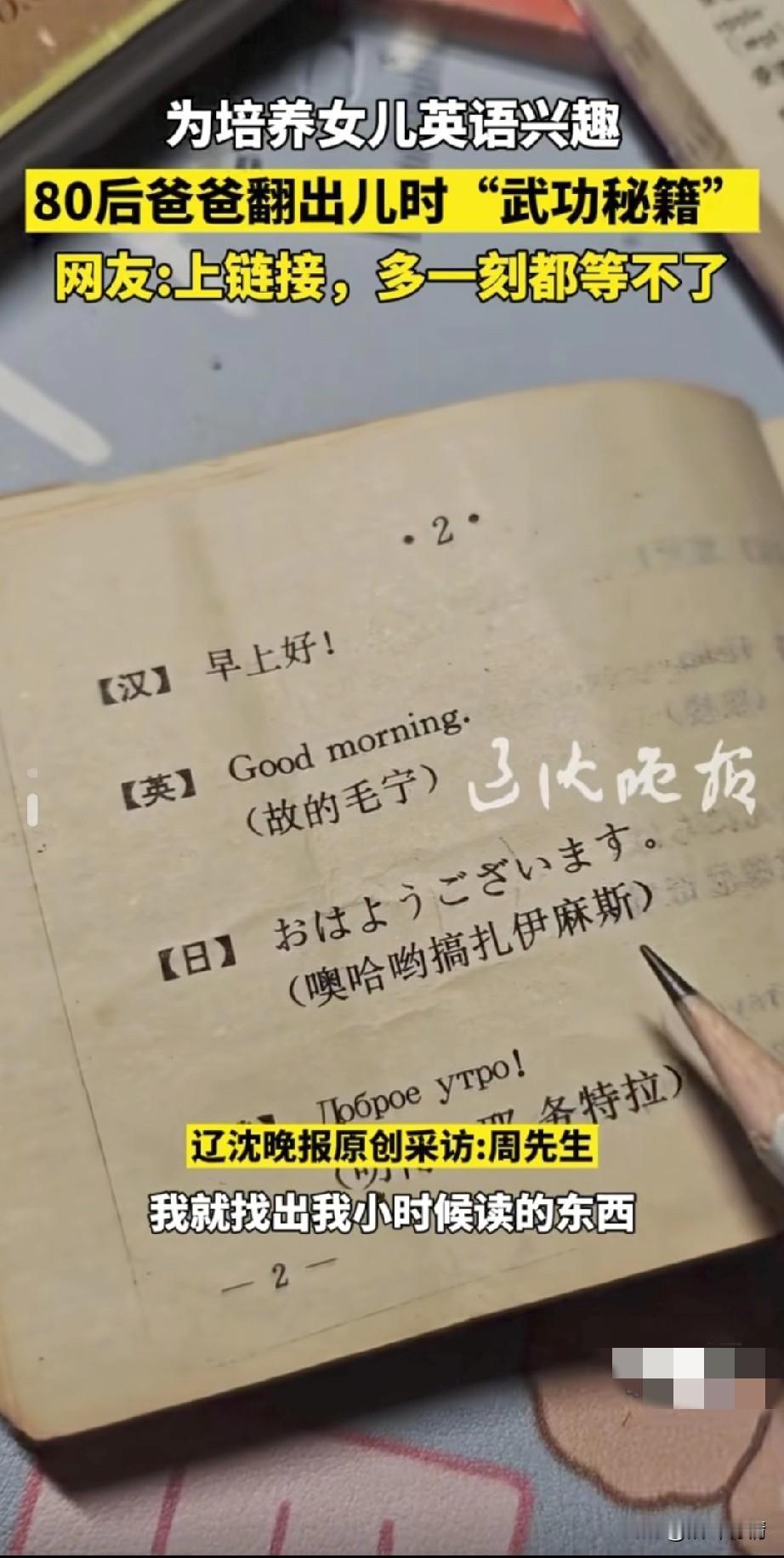 八零后父亲为了培养女儿学英语的兴趣,于是就将自己儿时候的秘籍拿出来,原来是将英语翻译成了汉语,甚至还有日语, 这些语言用汉语读出来, 那就容易多了, 你还别说味儿真正, 要是这样学英语, 大家都能学会了, 这可真是学英语秘籍, 原来八零后都是这样学英语的, 怪不得他们英语这么好, 原来是有秘籍的, 网友纷纷表示, 让他赶紧上链接, 这样的英语书都想拿一本, 毕竟对于中国人来说, 这样学英语太简单了, 大家对于这样学英语怎么看? 英语学习技巧 学英语 英语学习妙招 青少年学英语 娃英语学习 辅导娃学英语