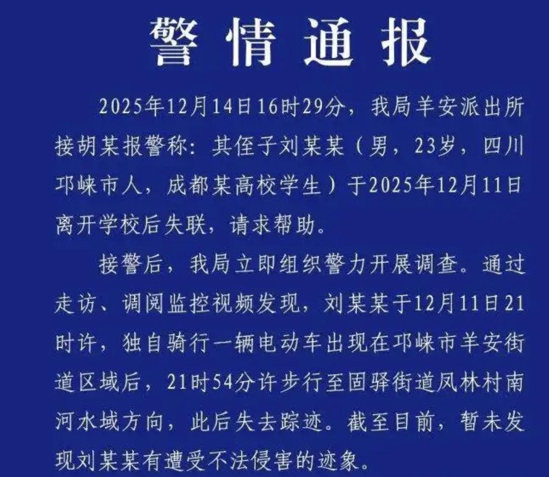 成都23岁的大学生失联9天后,他的遗体在河道中被打捞上岸,帽子叔叔确认为溺水身亡,并且也已经排除了刑事案件。既然已经排除了刑事案件,那他自杀的真相又是什么? 一般来说在做出极端事情之前,都会有一些反常的表现。可这起事件当中,校方表示没有察觉出异常,而家属这边表示只是跟家人联系的频率有所下降,言外之意就是看不出明显的异常。而结合他现在的年纪,基本上是有三种的可能:第一种就是学业问题,他今年23岁是一名大四的学生,明年6月份就毕业了。此时的他应该会有学业上的压力,之前也曾有人因为学业压力而想不开。 第二种就是感情问题,现在的大学生谈恋爱都是很常见的,可一些人比较脆弱,被分手之后一时想不开,所以就走了极端。第三种就是经济上的压力,比如现在一些大学生,都喜欢超前消费,而有些为了满足自己需求,则是会借网贷,最后债台高筑还不上,又不想跟家里人添麻烦,所以也有可能会想不开。 而对于这三种原因,我觉得第一种的可能性不太大,虽然大学生是有学业压力,但只要稍微努点力,基本上想要毕业不难!而第二种可能,也不是说不可能,但是概率也不是太大。现在年轻人都早熟,很多初高中都开始谈恋爱,在情场上是属于老手,不会因为闹个分手就要死要活的。而最有可能的就是第三种情况。当然了以上也是个人的猜测,也许真实的原因,并不属于这三者也是有可能的。 不过有一点咱们可以确认的是,无论是哪一种原因,这个男生心理都出了问题,而且还十分的严重。可悲的是在他走向极端之前,并没有人发觉他的心理问题,他自己无法消化,最终自己承受不住后,选择了以这样的方式来结束痛苦。其实相对于孩子,成年人的心理问题更严重,可惜的是却最容易被人忽略。