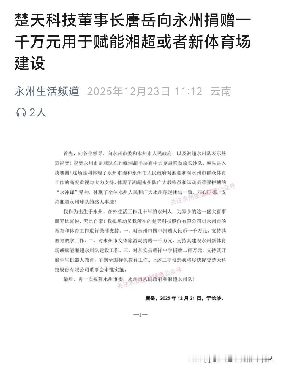 “告发子”永州队这下真的一夜暴富了!永州籍老板、楚天科技董事长唐岳直接官宣赞助,手笔相当大气! 12月20号晚,永州队在点球大战中击败长沙队,成功闯进2025湘超决赛。21号,身在长沙的唐岳就向永州方面致信祝贺,还决定捐赠1000万元用于建设永州新体育场,全力赋能湘超永州队发展。 除此之外,唐岳还宣布向永州四中捐赠1000万元,向东安耀祥中学捐赠200万元。三项捐赠合计2200万元,他表示会尽快提交楚天科技董事会批准落实。 算上这笔钱,永州队账面上至少有2000万了。一球成名、一夜“不差钱”,要是27号能拿下冠军,未来发展更是底气十足!其实这不仅是球队的荣耀,更是乡贤反哺家乡的暖心写照,既助力了体育事业,又支持了教育发展,这样的双向奔赴,真的太赞了!
