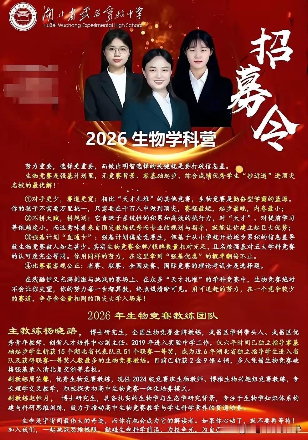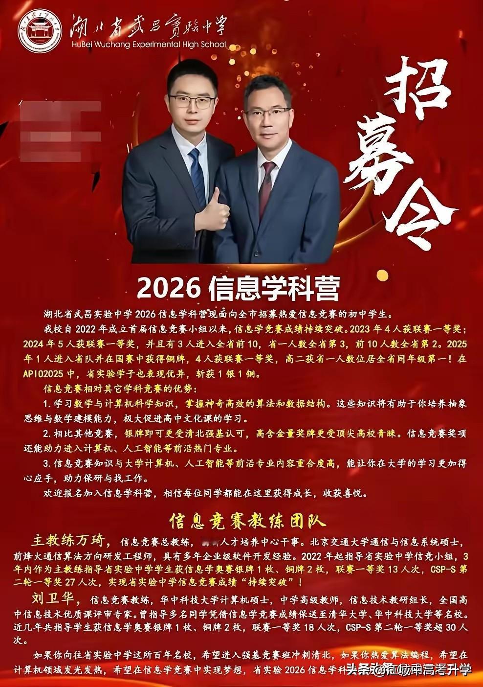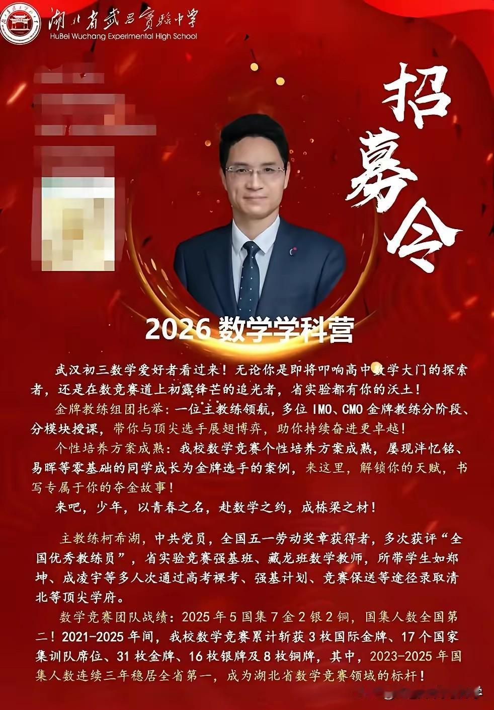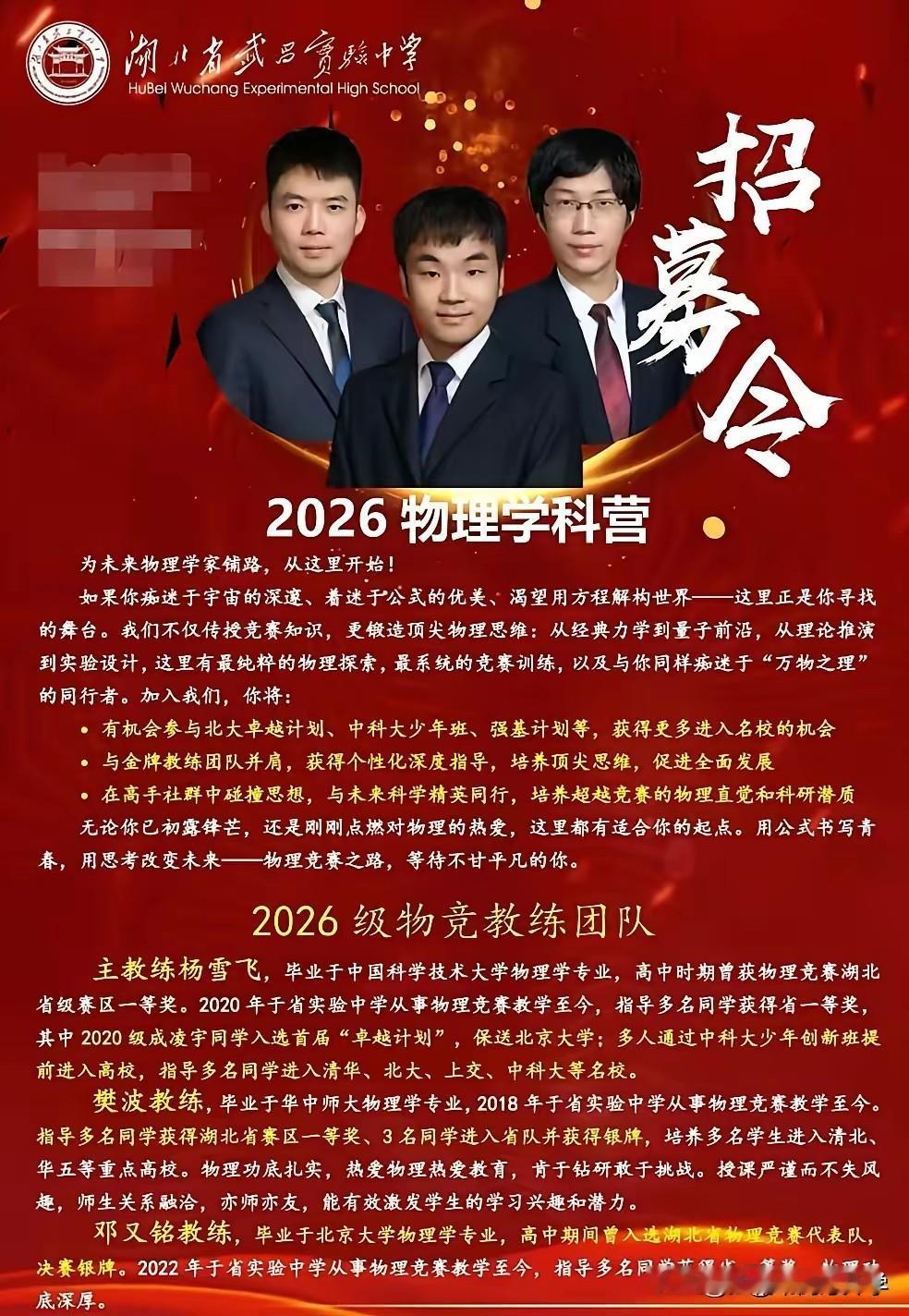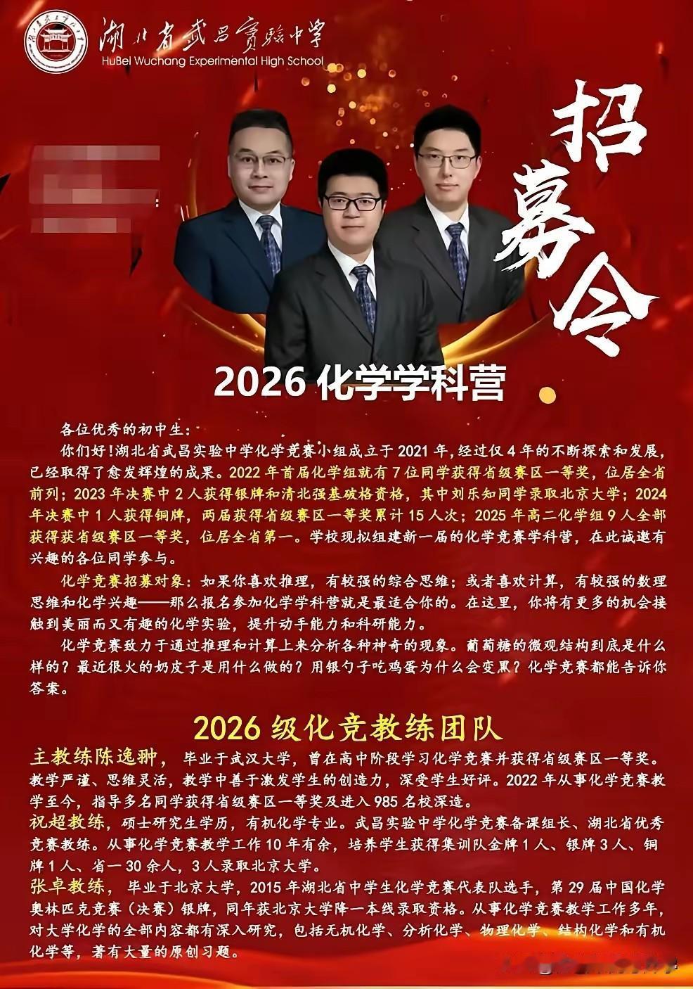 湖北省武昌实验中学开启2026年竞赛生招募 五大学科竞赛均开满,教练配齐, 直接大方的晒出了教练简历和获得的成绩, 教练基本上也都是高学历和有竞赛经历。 一个学校的竞赛班还是非常体现实力的, 而且也是非常消耗资源的, 在武汉只有四大名高和部分九大名高, 才有实力可以组建起竞赛班的。 竞赛班的同学选拔也是非常严格的, 最终即使没有拿到理想的竞赛成绩, 竞赛的学习经历对于未来的高考, 和大学学习也是大有裨益的。