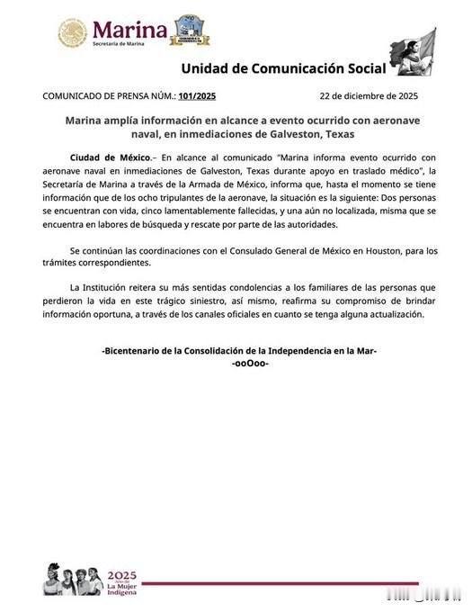 突发新闻:一架墨西哥海军军用医疗飞机在加尔维斯顿湾坠毁,造成5人死亡,机上载有烧伤患者 死亡人数上升了。 加尔维斯顿县警长吉米·富伦证实,周一一架墨西哥军用飞机在运送烧伤病人时坠入加尔维斯顿湾,造成5人死亡,2人获救,1人失踪。 机上共有八人,包括两名飞行员。 这架飞机从墨西哥起飞,正准备飞往加尔维斯顿,很可能是前往施莱纳儿童医院,结果在堤道桥附近的大雾中坠毁。 加尔维斯顿机场主任证实,这架飞机通常每年会飞往加尔维斯顿大约六次,定期将病人运送到当地医院。 休斯顿交通管理局的监控摄像头显示,事故发生时,加尔维斯顿堤道被浓雾笼罩。 包括美国海岸警卫队、德克萨斯州公共安全部和加尔维斯顿县警长办公室在内的多个机构已抵达现场。 堤道桥底部附近仍有大量执法人员和急救人员。 这是今年第二架坠毁的墨西哥医疗运输航班。 在 2025 年早些时候发生的另一起事件中,一架类似的航班在费城坠毁,机上 7 人全部遇难,地面上还有 1 人丧生。 一次以悲剧收场的救援任务。四条生命迷失在迷雾之中。