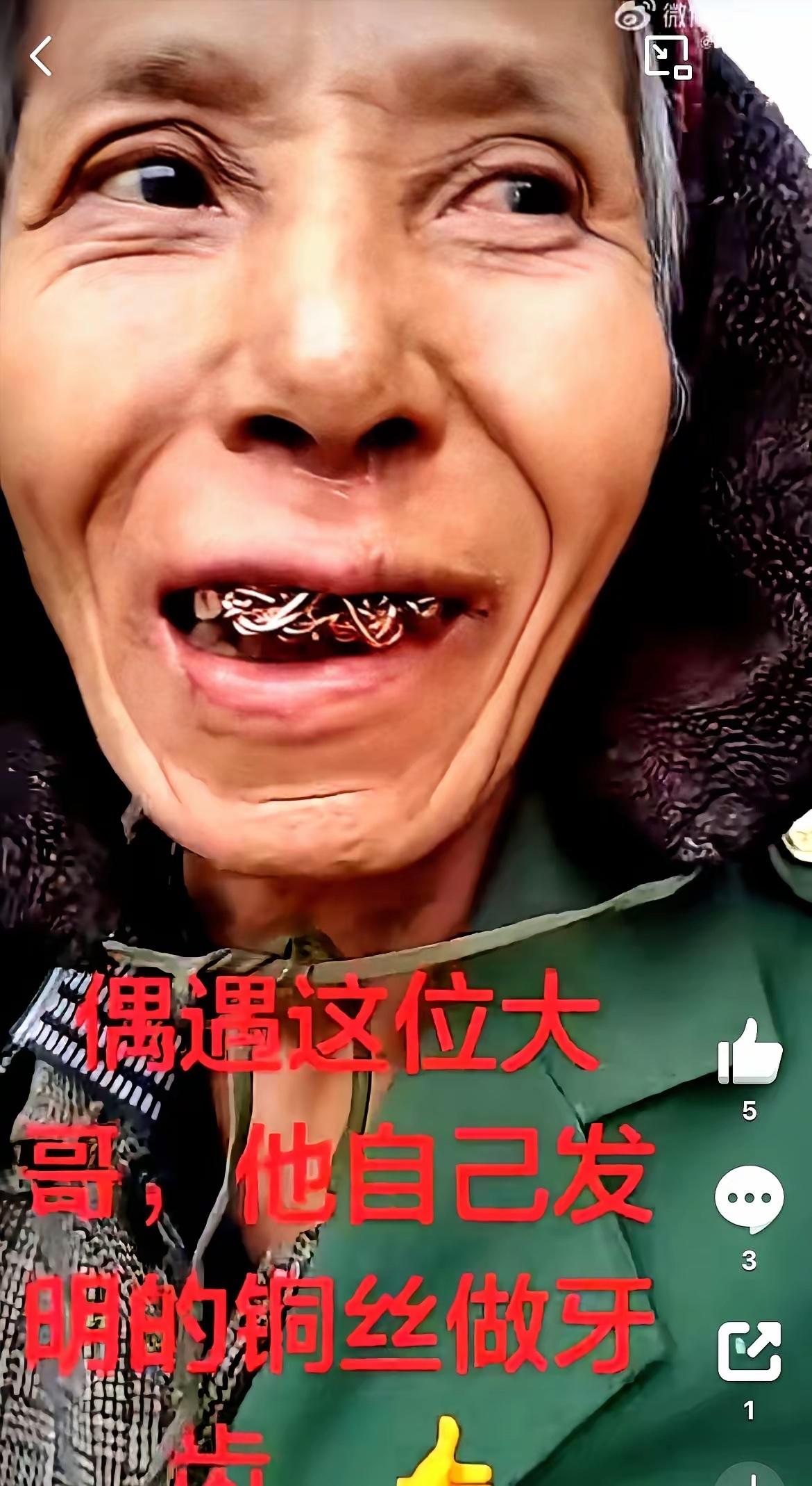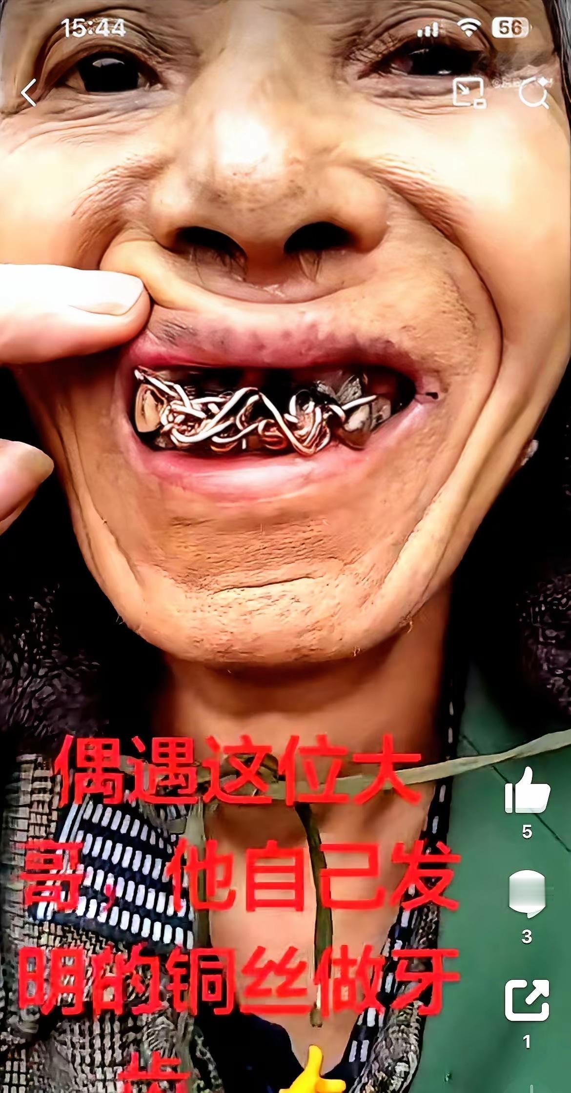 许多贵东西被中国人掌握技术后,不出几年就会实现大规模量产变成白菜价!然而据我所知现在牙科还没有变成白菜价,现在要弄一口假牙几千几万都是普通行情,一口好一点的假牙十万八万很正常! 这位被偶遇的大爷,据说是为了让自己嘴巴不至于瘪下去,就用铜丝给自己弄了几个假牙架,因为这个手艺做出来的东西根本没办法咀嚼东西! 现在许多边远贫困地区,上了年纪的许多人都是一口烂牙,因为弄牙齿太贵,大多数人想都没敢想花几个w去弄一口牙,哪怕小诊所几千块也是舍不得! 希望这个关乎每个人切身感受的牙科能够早日价格降下来,希望一口洁白整齐的平价牙齿能够早日走进寻常百姓家!