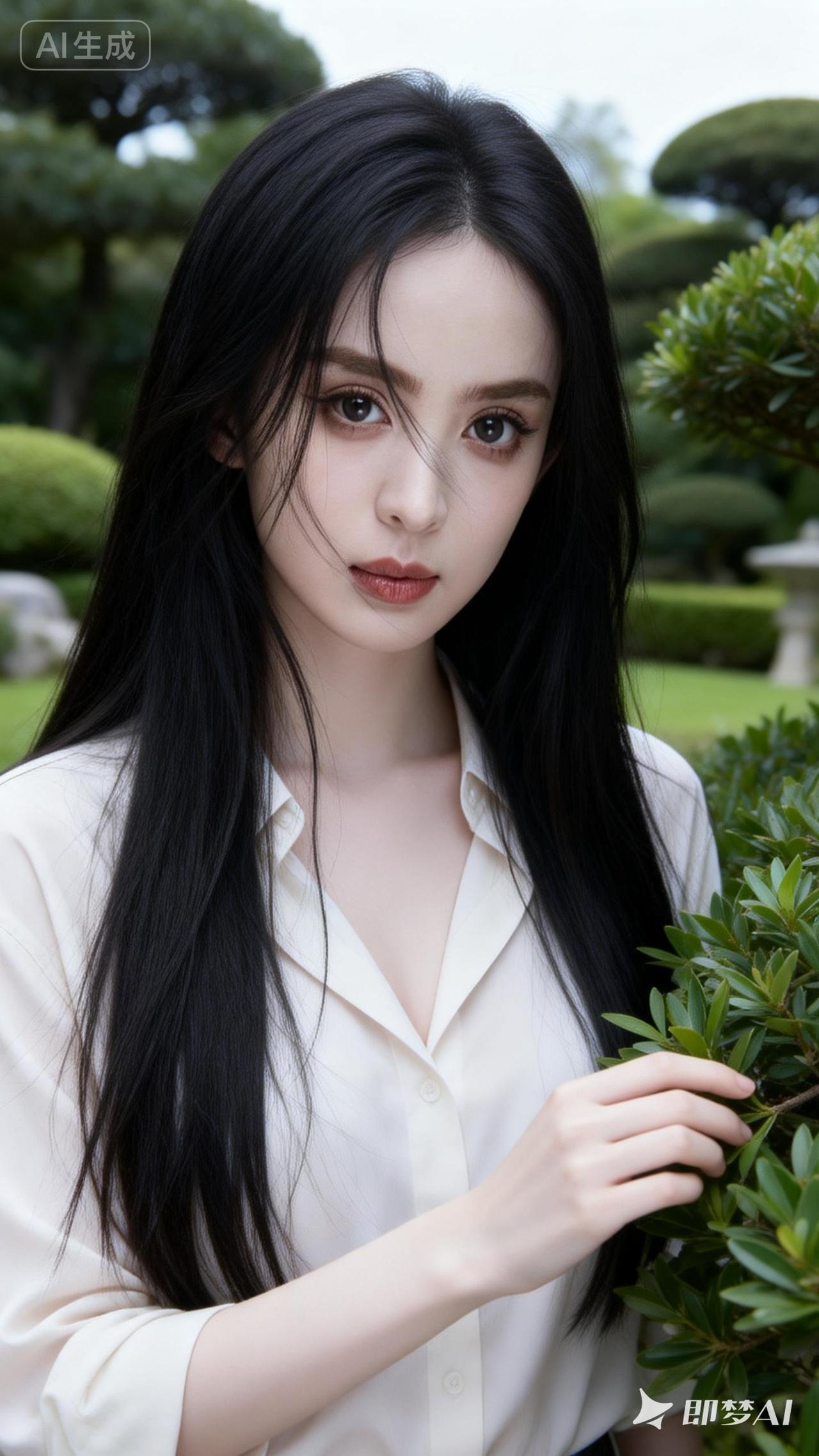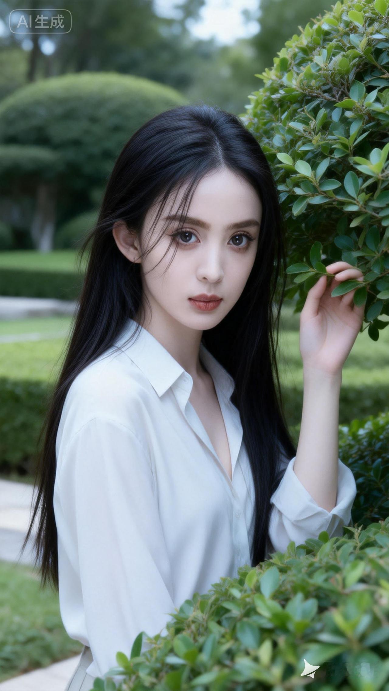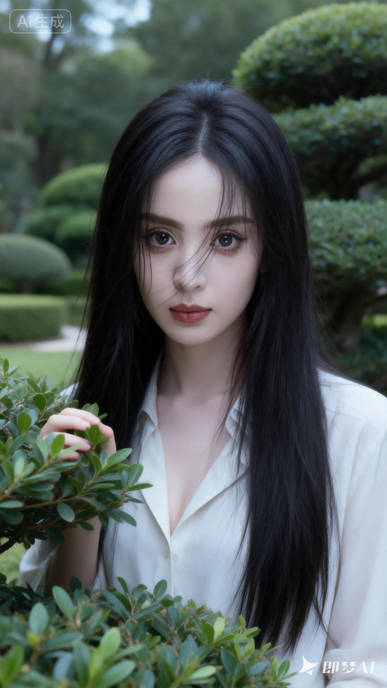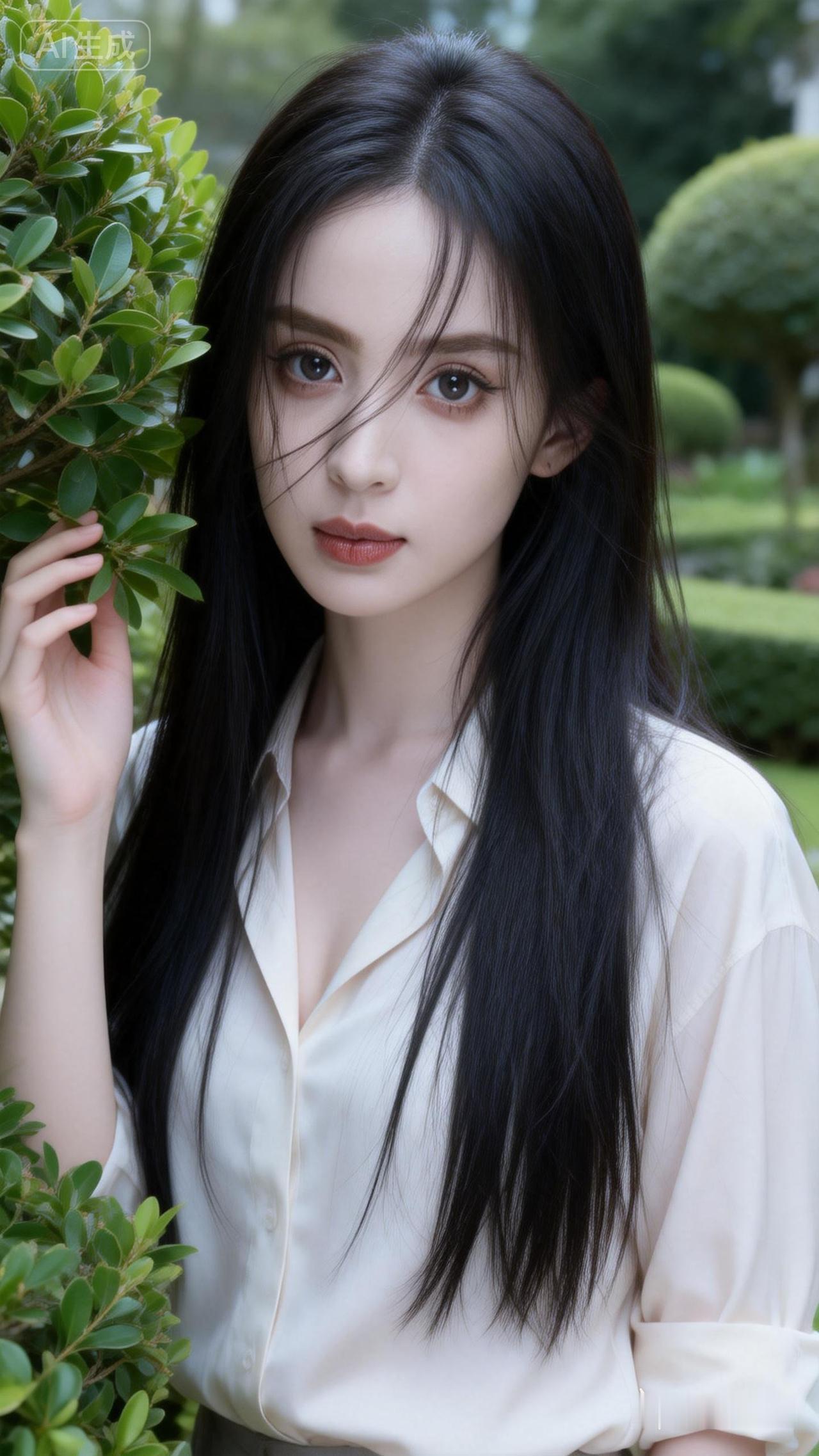 黑发少女与绿植的完美融合,自然清新,宛如画中人。