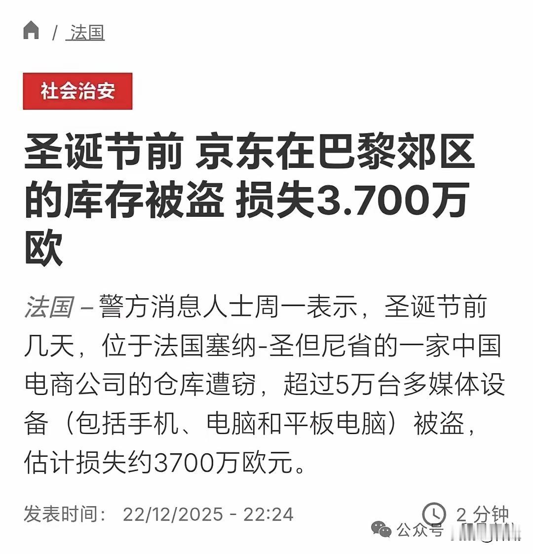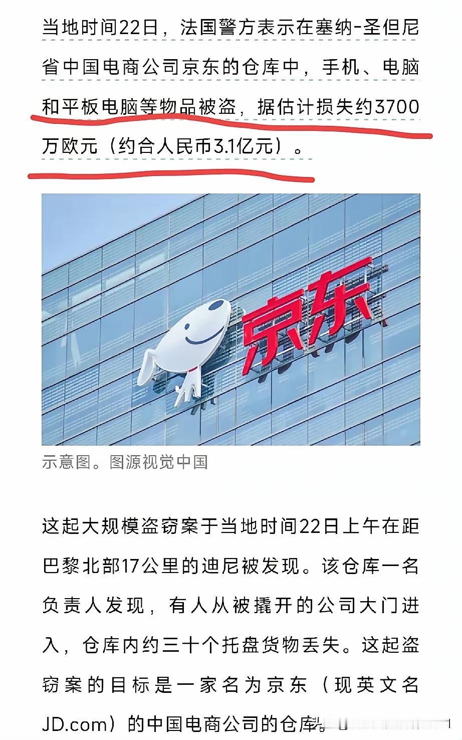京东巴黎仓库遭遇偷盗,损失3亿人民币。 这对于京东来说是不小的打击,3亿的物品真的不是小数目,这圣诞购物季还没有来临,这后院仓库就被洗劫一空。 看到事发的现场令人后怕,这损失的物资大量的是数码产品,其中有荣耀手机,笔记本电脑,还有oppo等设备,光是荣耀就有50456件,就连巴黎政府表示,此次的偷盗,可以说是巴黎近几年来都少见的“工业级盗窃案”。 从这现场的作案手法来看,这群人是惯犯,他们还是有组织有纪律,仓库的负责人查看仓库时,大门被撬烂,监控系统和报警系统全部瘫痪,这可是对偷盗者敞开了大门,想拿多少就拿多少。也有可能是这群人有内部人员参与,毕竟仓库的机密都是内部人知道,连仓库的运作规律都摸得很透彻。 希望法国能够尽快破案,减少损失。