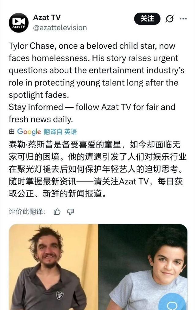 昔日童星沦落街头,美国“斩杀线”从不“区别对待”(个人观点) Tylor Chase出生于1989年9月6日,在亚利桑那州长大,青少年时期通过人才平台进入演艺圈。2004到2007年,他在那部尼克国际儿童频道的校园喜剧里饰演Martin Qwerly,一个反复出现的角色,性格夸张,常常带来笑点。 那部剧播了三季,他参与了不少集数。同期还客串过其他节目,2007年在一部独立电影里演主角年轻版本,后来又为游戏配音。演艺起步阶段算平稳,曝光机会逐步增加,但之后作品不多,渐渐淡出视线。 美国社会里,有些人一旦健康或经济出点问题,就容易触发连锁反应,生活快速下滑到底层,这种情况不看你以前多风光。网上最近又传开Tylor Chase的视频,他36岁了,看起来衣衫破旧,裤子松垮需要拉着腰带。路人认出他,问起旧剧,他还记得自己在尼克频道那部校园剧里演过。 视频传开后,有人发起众筹,很快凑了1200多美元,想帮他买吃的穿的。但他母亲很快联系发起人,要求关掉页面,说儿子有双相情感障碍,需要的是专业医疗,这不是钱能解决的,因为他管不住钱和药,手机买了也容易丢。 这种下滑过程,在美国挺常见。很多人表面过得体面,其实没啥缓冲,一次医疗账单或失业,就能连锁崩盘:付不起房租被赶走,丢了住所就难找工作,工作没了收入更低,医疗费用继续堆积,形成死循环。Tylor Chase的情况就是典型,他确诊双相情感障碍后,治疗开支大,管理药物和生活都难,逐步失去固定住所。 类似例子不少,普通上班族也一样,一场病或小事故,就能把人推到街头。网上把这叫“斩杀线”,借自游戏术语,意思是跨过某个临界点,系统就直接把你清出局,不分身份背景。昔日童星也逃不过,娱乐圈光鲜背后,很多人成年后没稳定支撑,精神健康问题一爆发,就容易滑到底层。 母亲反复强调,钱不是关键,他得接受医疗干预才行。旧伙伴们也表示会尽力,但现实是,这种问题短期关注多,长期跟进难。Tylor Chase的故事,让人看到美国社会对底层或精神健康问题的处理方式,没太多兜底,一旦掉下去,翻身机会小。很多人感慨,童星光环褪去后,跟普通人没区别,遇到“斩杀线”一样无差别对待。