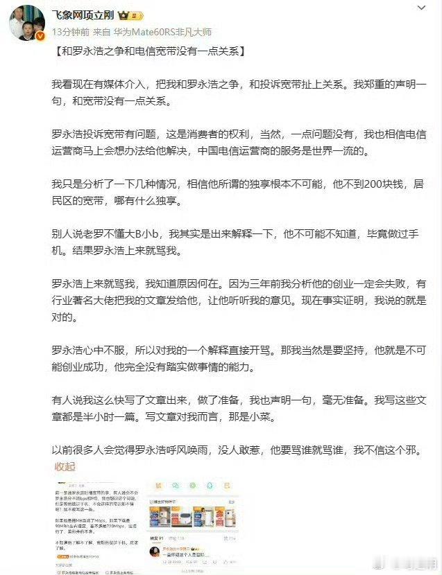 项立刚老师说他和罗永浩之争与宽带没有一点关系。我有点怀疑项立刚老师文科也没毕业,或者是他忘了九年义务制已经全民扫盲,对他写的小b和大B的几行字,还是能看清楚的。对了,项立刚说“中国电信运营商是世界上一流的”,这句话没法反驳,因为没使用过国外的电信服务,只能他说是最好的 那就是最好的,没有对比肯定没有高低的对比。不过,自美国联邦通信委员会(FCC)要求三大运营商在14天内解决其在美国反自动拨号骚扰数据库(RMD)中的认证问题,可以看出三大运营商的国际服务是高效的。项立刚说“业内大佬”把他的文章发给了老罗。好奇一下,“业内”是哪个“业内”?“大佬”又是哪个“大佬”?总以为玩八卦的是市井文化,没想到“大佬”也架秧子瞎起哄。这里还有个疑问,项立刚说他写微博大概也就半小时,这里想请教看不起文科的项老师,写微博不需要核实信息,信手拈来,可有实证和逻辑保证?严肃一点说,文科和理科写优秀的微博,都会注重实证和逻辑,项老师说的他和罗永浩之间“和宽带没有一点关系”,是典型的反言,这个他忘了?还是忘了?要镇定,不要手忙脚乱,颠三倒四。