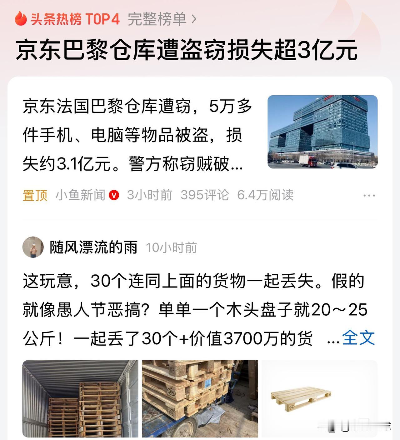 京东被盗 3.1 亿:欧洲“遮羞底裤”没了! 罗浮宫被盗,京东 3.1 亿被盗,这就不是简单的被盗了,这可以说是“明抢”了吧?30 几个托盘啥的,光运出去就得几小时吧,这确定没里应外合吗?确 1、欧洲已经🈚️安全可言,卫生差,到处尿骚味已经算是好的了,现在这么大公司都敢盗,欧洲你真的可以。 2、中国公司出海了,才知道做生意不是生意法则问题,还得和当地盗贼,去斗智斗勇,再这么下去,都要自己建立安保队伍,搞武装了。