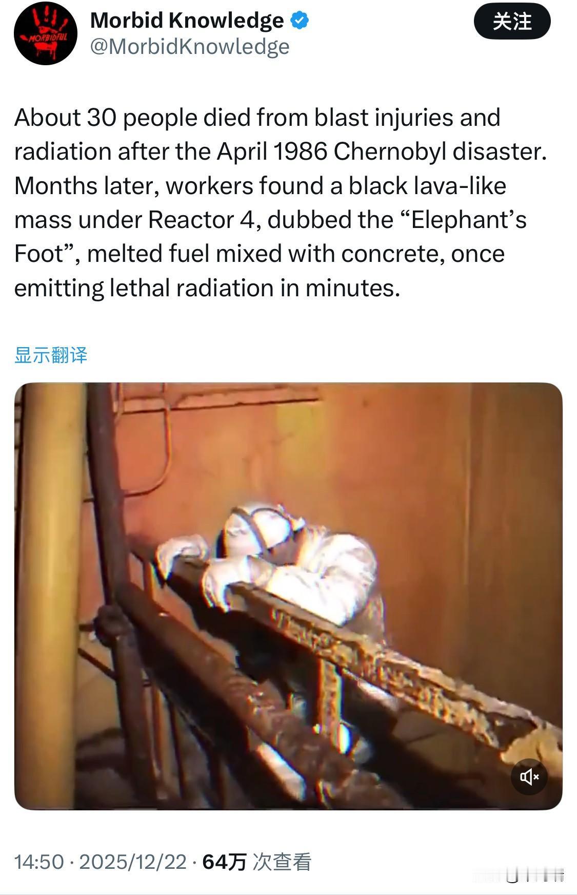 1986年4月切尔诺贝利核事故发生后,约有30人死于爆炸伤和辐射。几个月后,工作人员在4号反应堆下方发现了一块黑色熔岩状的物体,被称为“象脚”,它是熔化的燃料与混凝土的混合物,曾在几分钟内释放出致命的辐射。 “象脚”是切尔诺贝利核电站下方形成的一大块放射性废料。 照片中的男子是核设施检查员阿图尔·科尔涅耶夫,也被称为“历史上受辐射最严重的人”。尽管多次前往核设施,他仍然活着。