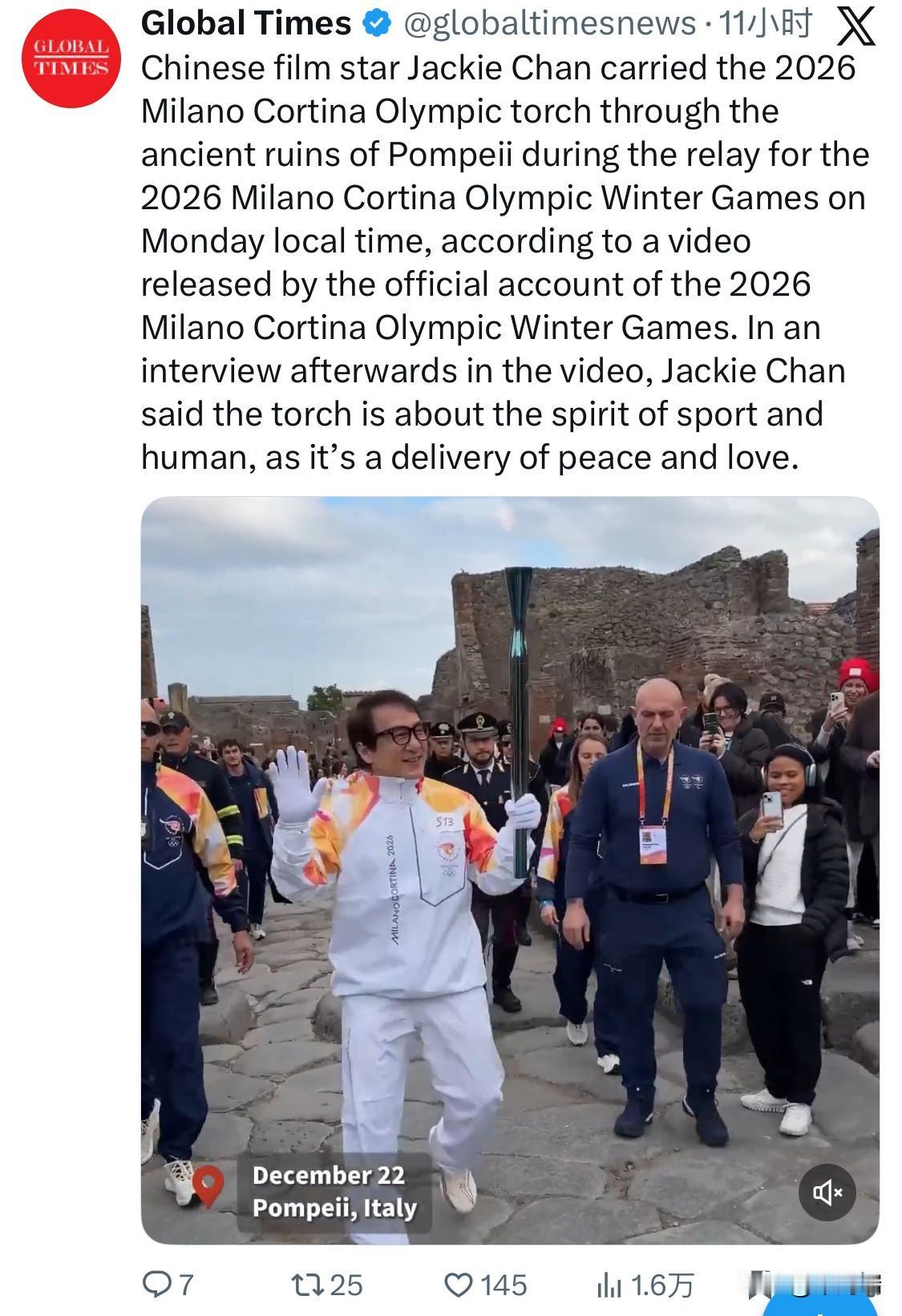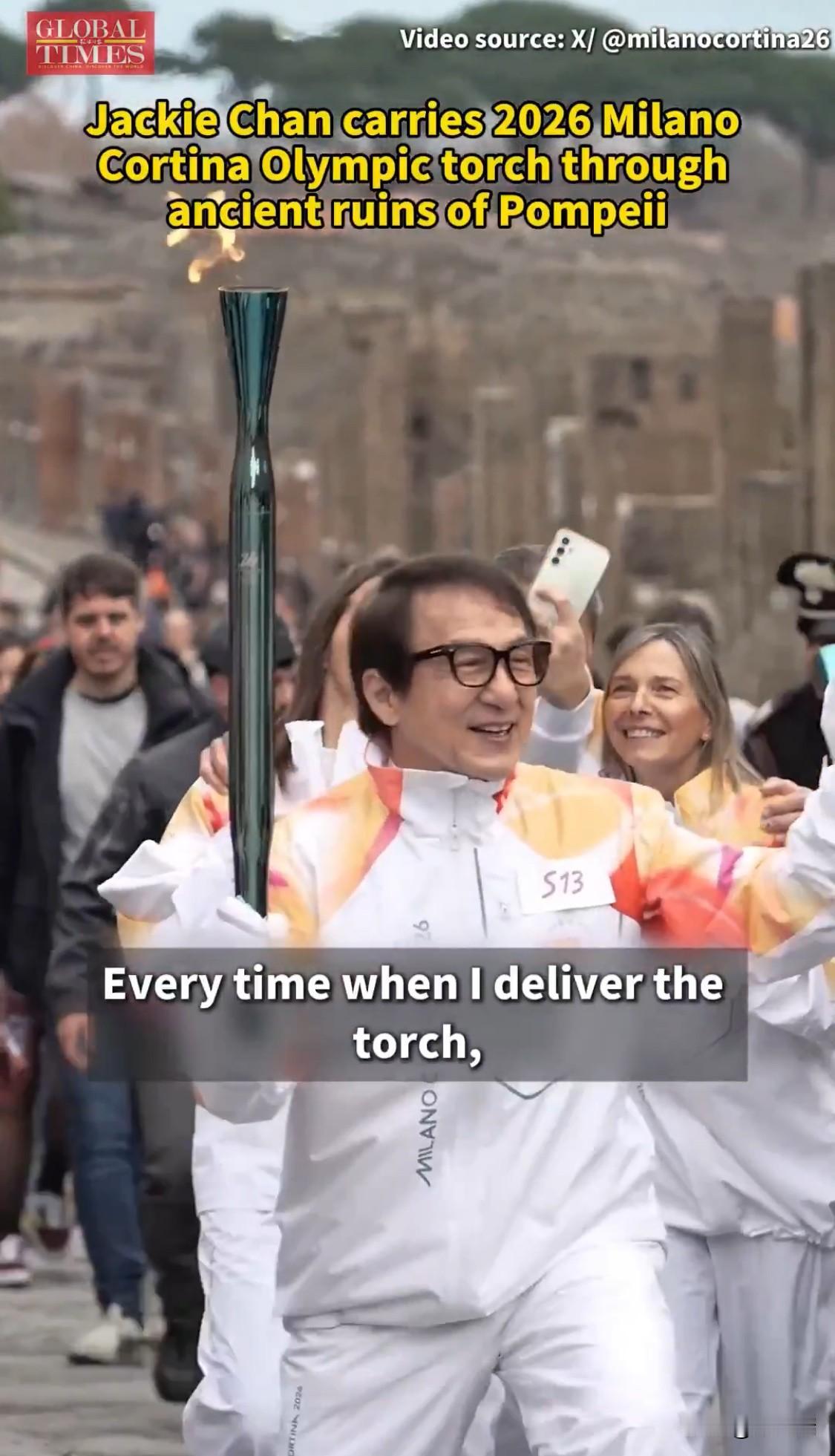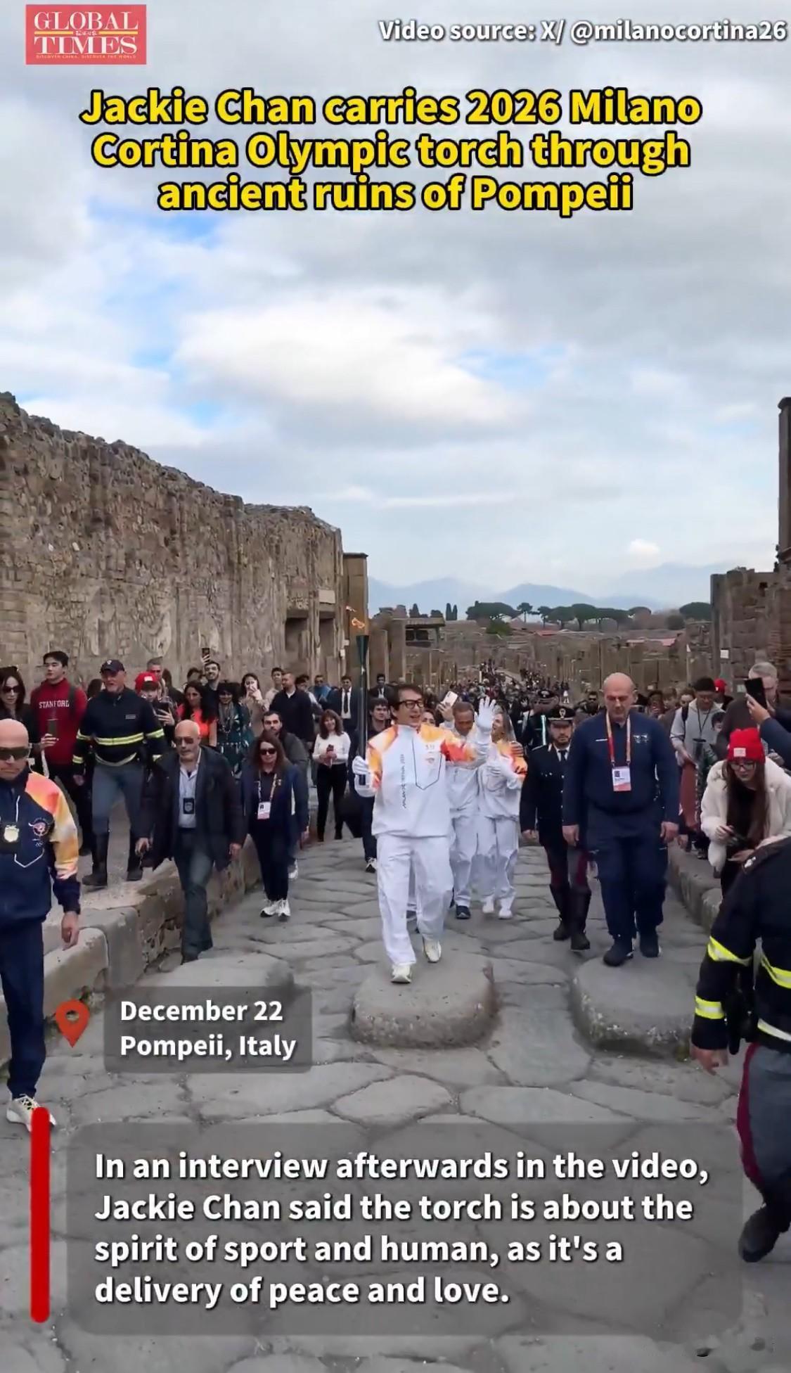 据2026年米兰-科尔蒂纳冬奥会官方账号发布的视频显示,中国影星成龙于当地时间周一在庞贝古城遗址中传递了2026年米兰-科尔蒂纳冬奥会火炬。视频中,成龙在随后的采访中表示,火炬象征着体育精神和人性,传递着和平与爱。