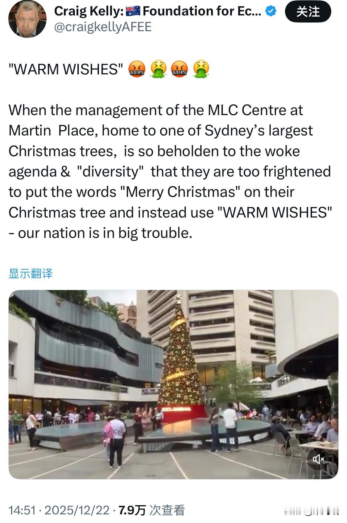 “温暖的祝福” 当马丁广场的MLC中心(澳大利亚悉尼最大的圣诞树之一所在地)的管理层如此受制于觉醒议程和“多元化”,以至于他们不敢在圣诞树上写上“圣诞快乐”,而改用“温暖的祝福”——我们的国家就麻烦大了。