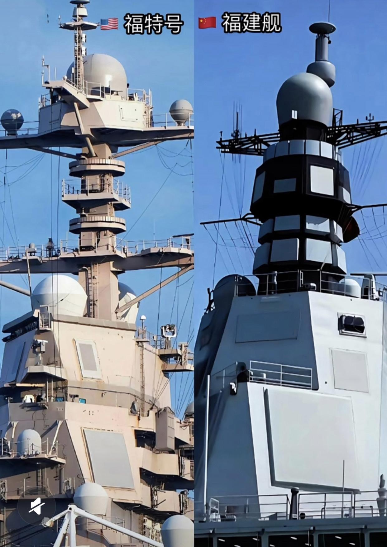 中国第一艘电磁弹射型航母福建舰舰岛上的相控阵雷达与美国第一艘电磁弹射型福特舰的对比图。
