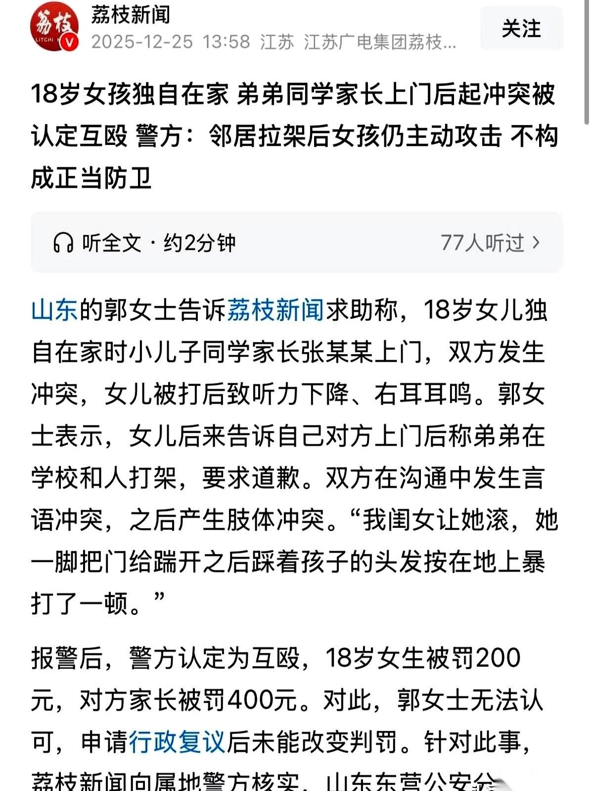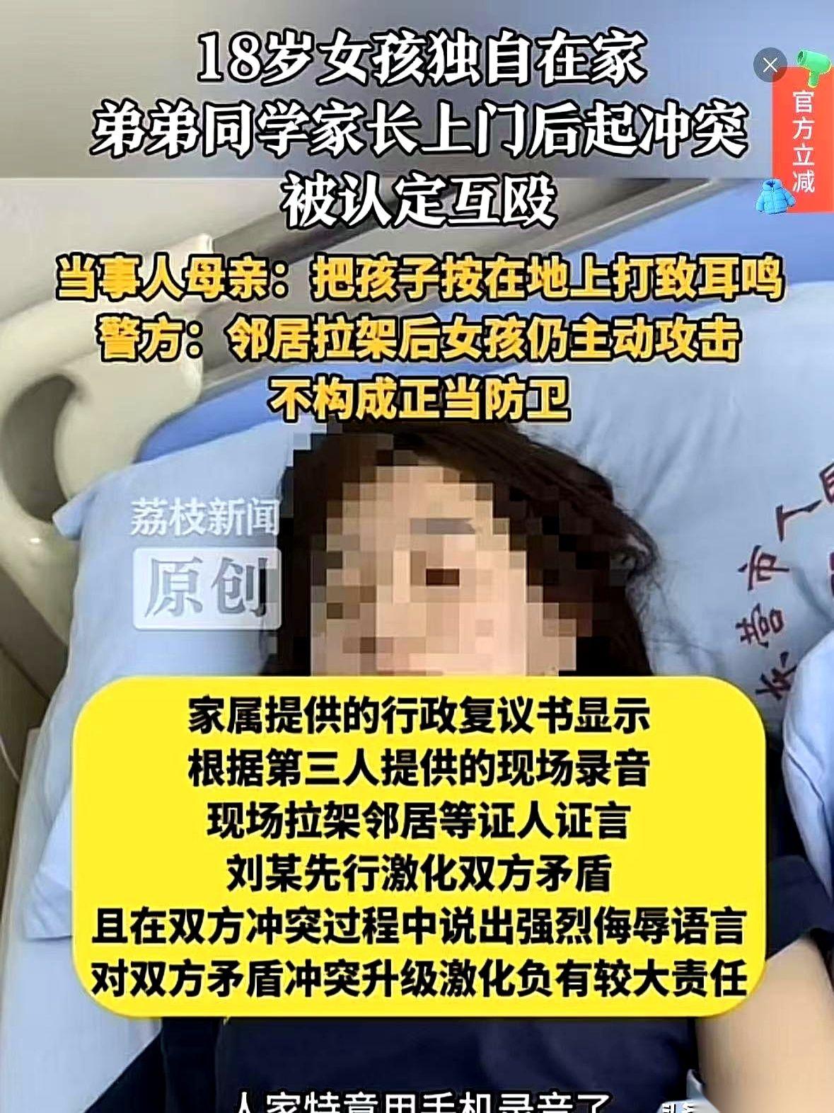 离谱,太离谱了。 一个18岁的姑娘,自己在家,被人闯进来按在地上打,最后的结果是——“互殴”。 她,罚款200。 我每次看到这种事,都感觉一口气堵在胸口。 什么叫“互殴”?是我俩约好了,时间地点人物齐全,叮叮咣咣干一架,那叫互殴。 一个姑娘,在自己家里,门被强行闯开,一个比她重几十斤的大男人把她按在地上揍,打到头皮血肿,打到耳朵嗡嗡响。 这叫什么?这叫入室行凶,这叫单方面吊打。 就因为有人作证,说姑娘在被人拉开后,气不过,还手扇了对方两巴掌。 所以,性质就变了?就成了“互殴”? 我真的想问问。 是不是以后谁再遇到这种事,就得双手抱头,躺在地上,一动不动,像个圣人一样默念“他强由他强,清风拂山岗”,才配得上“完美受害者”的称号? 那不叫还手。 那叫一个被逼到绝境的人,求生的本能。 那叫一个人在尊严和身体被双重侵犯时,最后一点不屈的挣扎。 更可笑的是证据。 对方来了4个人,口供那叫一个“天衣无缝”,都说是小姑娘先动的手。 我寻思着,他们一伙的,难道还会帮你说话吗? 还有一个不知道从哪儿冒出来的“邻居李某”,成了定性的关键。可人家家属找遍了整栋楼,都查无此人。 这事儿看得我后背发凉。 它不是一个新闻,它像一面镜子,照出了我们每个普通人的恐惧。 就是当你孤立无援时,当常识和逻辑都失灵时,你那点本能的自保,会不会就成了你“也有错”的罪证? 说到底,什么叫正当防卫? 我觉得,当一个陌生人闯进你家,对你动手的那一刻起,防卫就已经开始了。 不该是等你被打个半死之后,才“有资格”反抗。