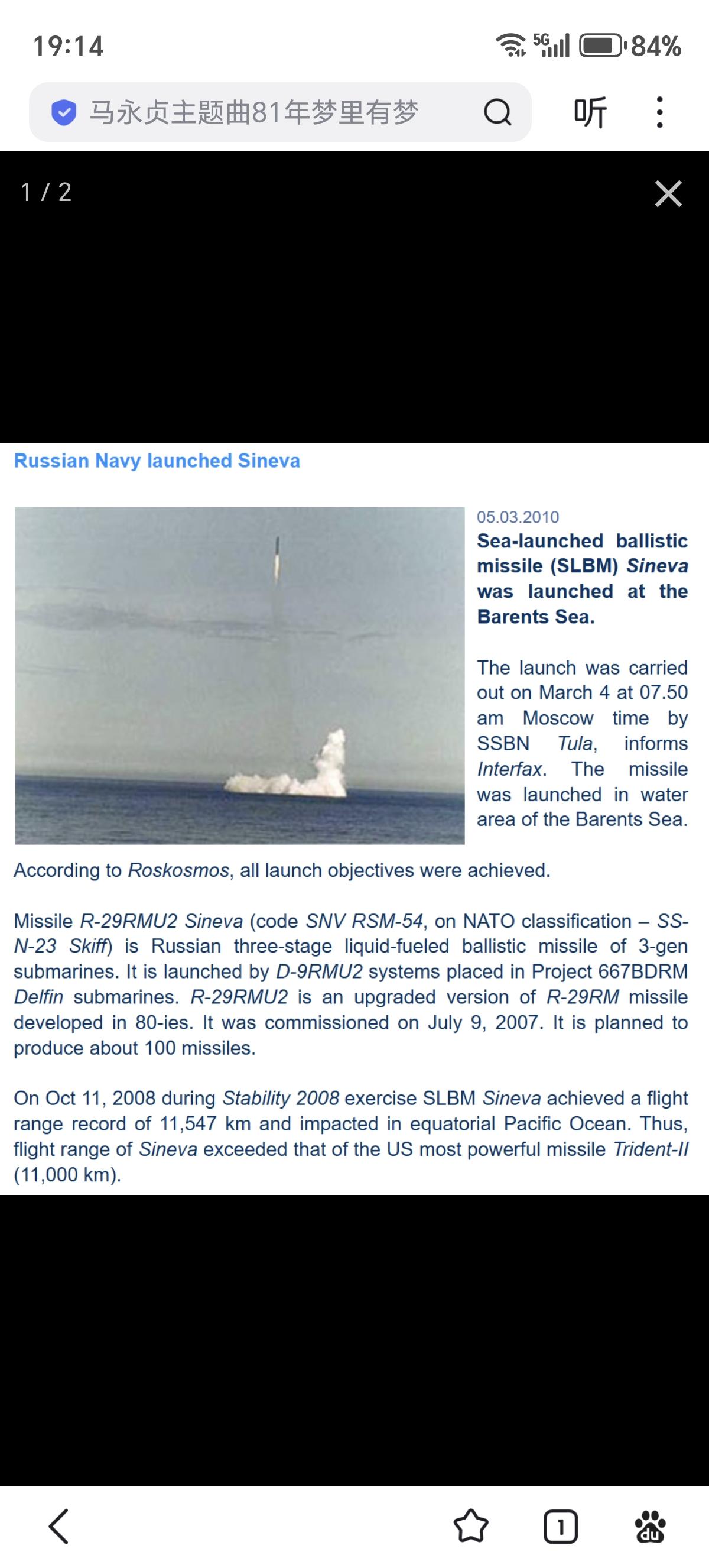 俄罗斯联邦神力:2008年10月11日,在“稳定-2008”演习中,一枚由667BDRM型弹道核潜艇K-114“图拉”号发射的携带2吨模拟弹头载荷的R-29RMU2潜射洲际弹道导弹(该型导弹于2007年7月9日根据俄罗斯联邦总统令正式服役)创下了苏(俄)潜射导弹的射程记录——11547千米。 R-29RMU2“蓝色”/R-29RMU2.1“班轮”是苏联/俄罗斯最后一代液体燃料(偏二甲肼+四氧化氮和硝酸)潜射洲际弹道导弹,其能够以40.3吨的发射重量,分别携带4枚500KT当量的3G37中型弹头或10枚150KT当量的3G32轻型弹头时达到9000-11000千米的射程,精度(CEP)小于200米。