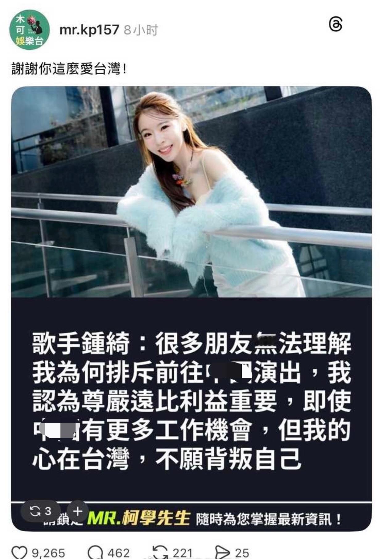 台湾歌手钟绮发文表示,很多朋友无法理解她为何这么排斥去大陆开演唱会,那是因为她心在台湾,不愿意背叛自己,她认为,尊严比利益更重要,即使在大陆有更多工作机会,能挣到更多钱,但她不在乎这些,因为她热爱台湾。