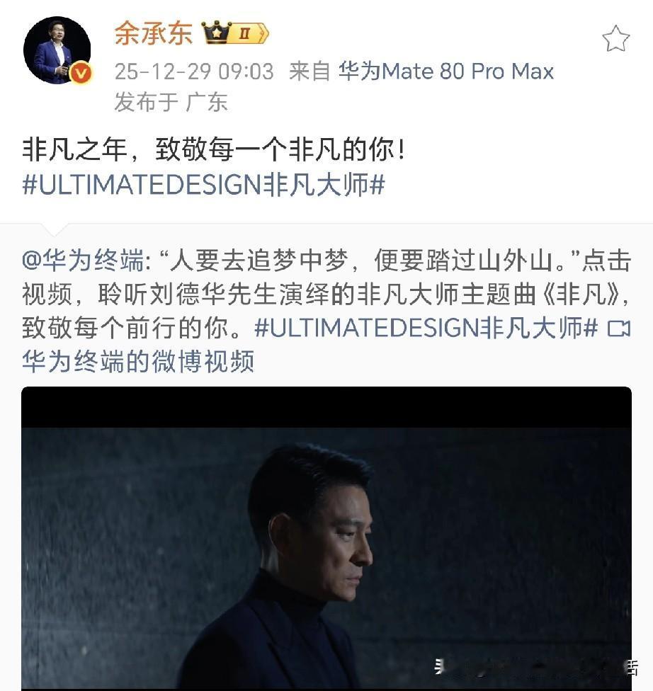 余承东:非凡之年,致敬每一个非凡的你! 在2026即将到来之际,回望2025年,致敬每一个平凡的自己! 追过梦中梦,踏过山外山,何来的非凡。每天都认真过,每个梦都不遗憾。仰望过星河,也曾俯身耕种过平淡。人生的路越简单,越不简单,为一件事过万重山,何来的非凡。 平凡人生中的每一步都是非凡的体验,不后悔过往的每一个决定,只愿追逐梦想,未来可期。
