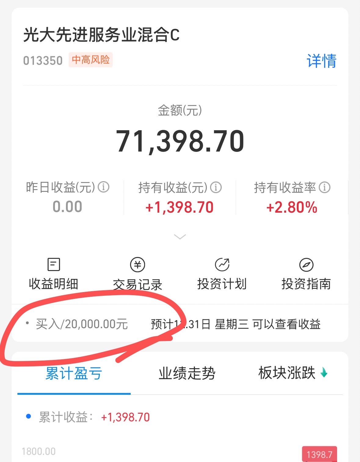 光大先进服务013350,这个消费基我是为明年布局的,没想到已经有不错的收益了,今天再买两万,试水后发现越超出预期的后面越会多买。