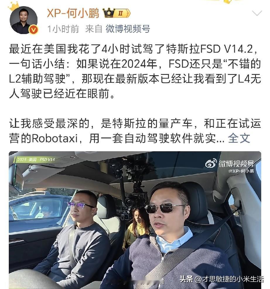 何小鹏:试驾了特斯拉FSD V14.2,现在最新版本已经让我看到了L4无人驾驶已经近在眼前。 小鹏汽车何总在美国花了4小时驾了特斯拉FSD V14.2,试驾结果让何总非常震撼! 何总表示未来3年,有全自动驾驶能力的汽车才是下一代智能汽车,类似iPhone出来时,所有以前的智能手机都成为了功能机那样。 何总说在2026年,无论美国,还是中国,下一代真正的,全自动驾驶会真正到来,直接从L2到L4(L3已经被跳过),小鹏的Ultra版本将会实现完全下一代的自动驾驶! 怎么说呢,技术控的CEO就是不一样,何总亲自体验最强竞争对手,找差距,补短板,小鹏进化的速度令人惊叹!想象一下,周末自驾游,车自己开,我躺在车里看风景,这日子美滋滋!唉,自己赚钱实在太慢了啊,赶紧挣钱吧!你们觉得呢?