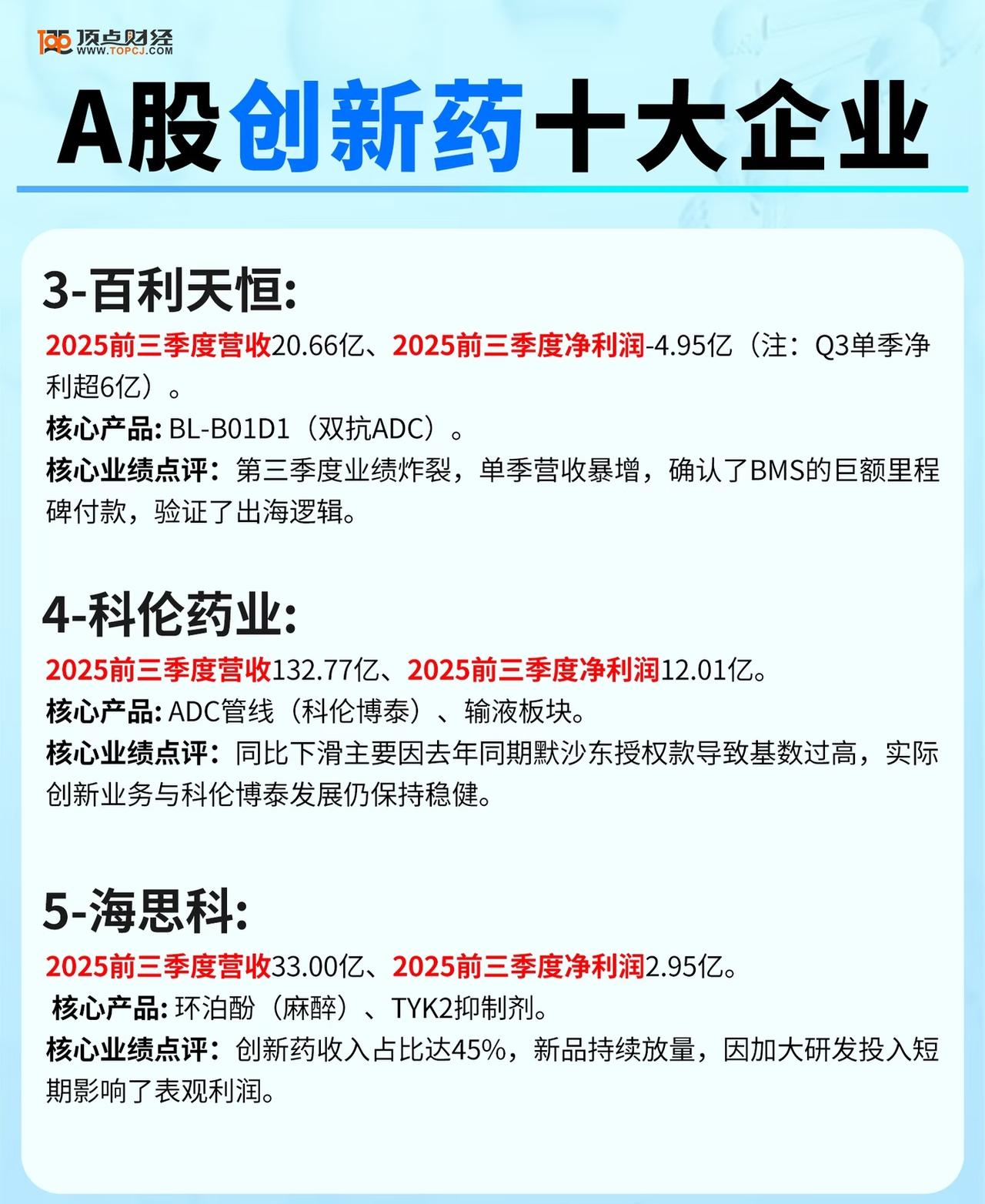 A股创新药十大企业2025前三季度核心信息总结如下: 前五企业:百济神州营收最高(275.95亿),首次扭亏(净利11.39亿);恒瑞医药营收231.88亿、净利57.51亿,创新药占比提升;科伦药业营收132.77亿、净利12.01亿,创新业务稳健;海思科营收33亿、净利2.95亿,创新药占比45%;百利天恒营收20.66亿、净亏4.95亿(Q3单季净利超6亿),BL-B01D1验证出海逻辑。 6-8位:华东医药营收326.64亿居榜首、净利27.48亿,医美+创新药双驱动;艾力斯营收37.33亿、净利16.16亿,靠伏美替尼高增长;君实生物营收18.06亿、净亏5.96亿,亏损收窄。 9-10位:荣昌生物营收17.20亿、净亏5.51亿,核心产品放量;迪哲医药营收5.86亿、净亏5.80亿,商业化早期爬坡。