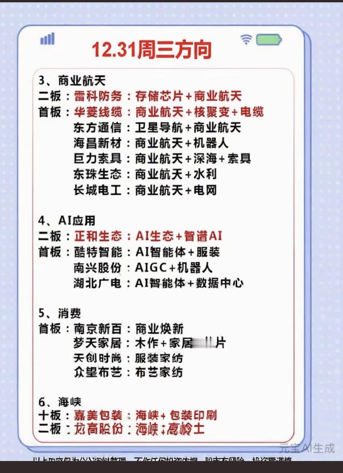 12.31周三 盘前 市场热点方向前瞻! 1.机器人 2.汽车链,减速器 3.商业航天,航天材料碳纤维等 4.智能ai应用 5.液冷硬件 6.锂电池相关