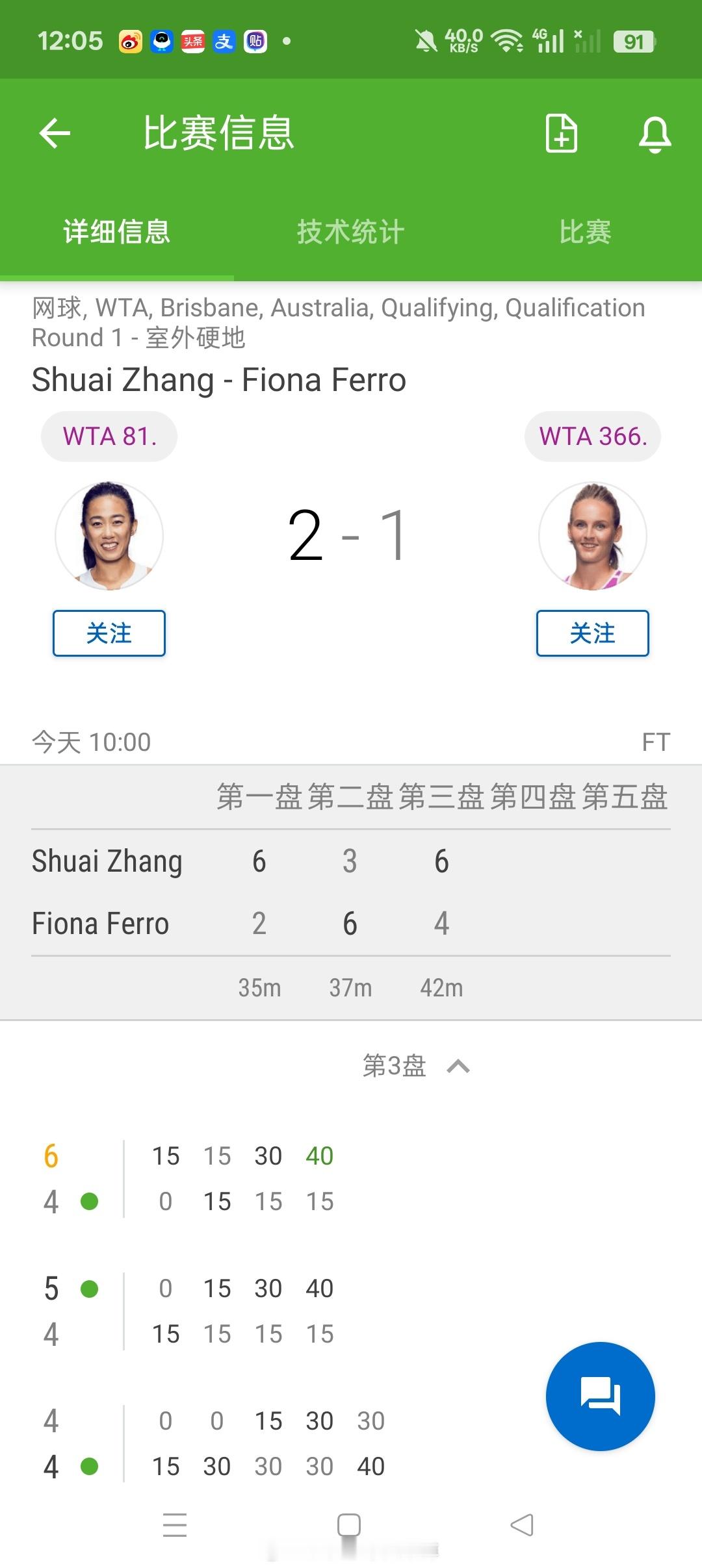 小花小草资讯【 布里斯班WTA500】女单资格赛第一轮🇨🇳张帅6-23-66-4击败🇫🇷球员费罗晋级资格赛决胜轮张帅收获13分