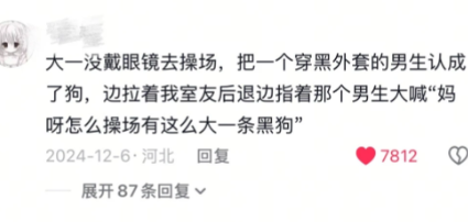 大一没戴眼镜去操场,把一个穿黑外套的男生认成了狗,边拉着我室友后退边指着那个男生大喊"妈呀怎么操场有这么大一条黑狗"