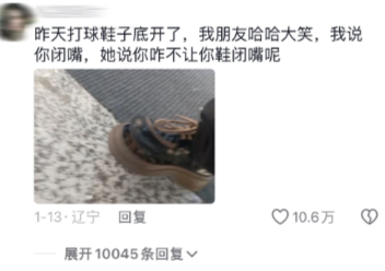 昨天打球鞋子底开了,我朋友哈哈大笑,我说你闭嘴,她说你咋不让你鞋闭嘴呢