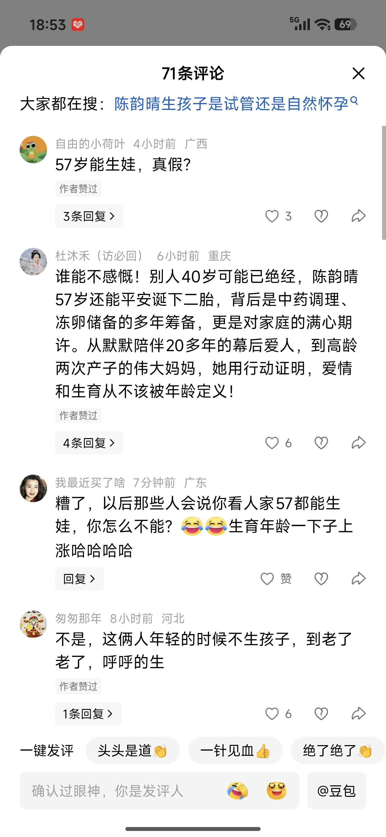 古巨基的老婆又生还是又怀上了二胎?陪了他二十年才感受到爱?娶回家52岁生头胎。58二胎。明星真是牛啊!咋做到的! 别说这个试管,试管也不是谁都行的。我见过做了八次试管,都失败的。后来离了,跟前婆婆处的可好了的。 就她着床的那地方,据老太太说都是紫色的,都相当于死肉。 这明星的保养真不一样的。陈韵晴真厉害。生吧,多生几个。能养得起。