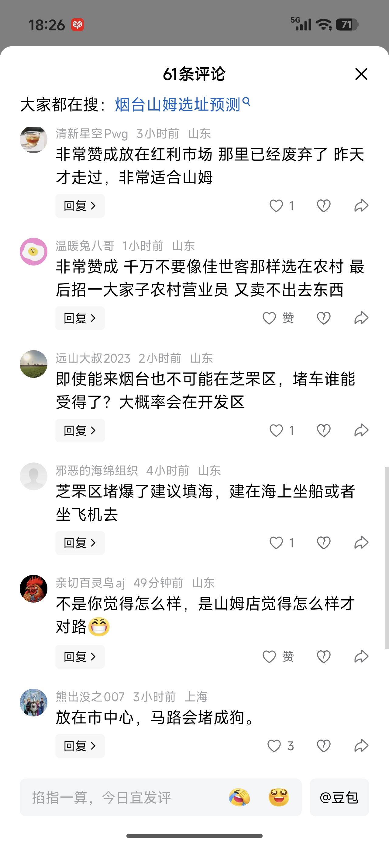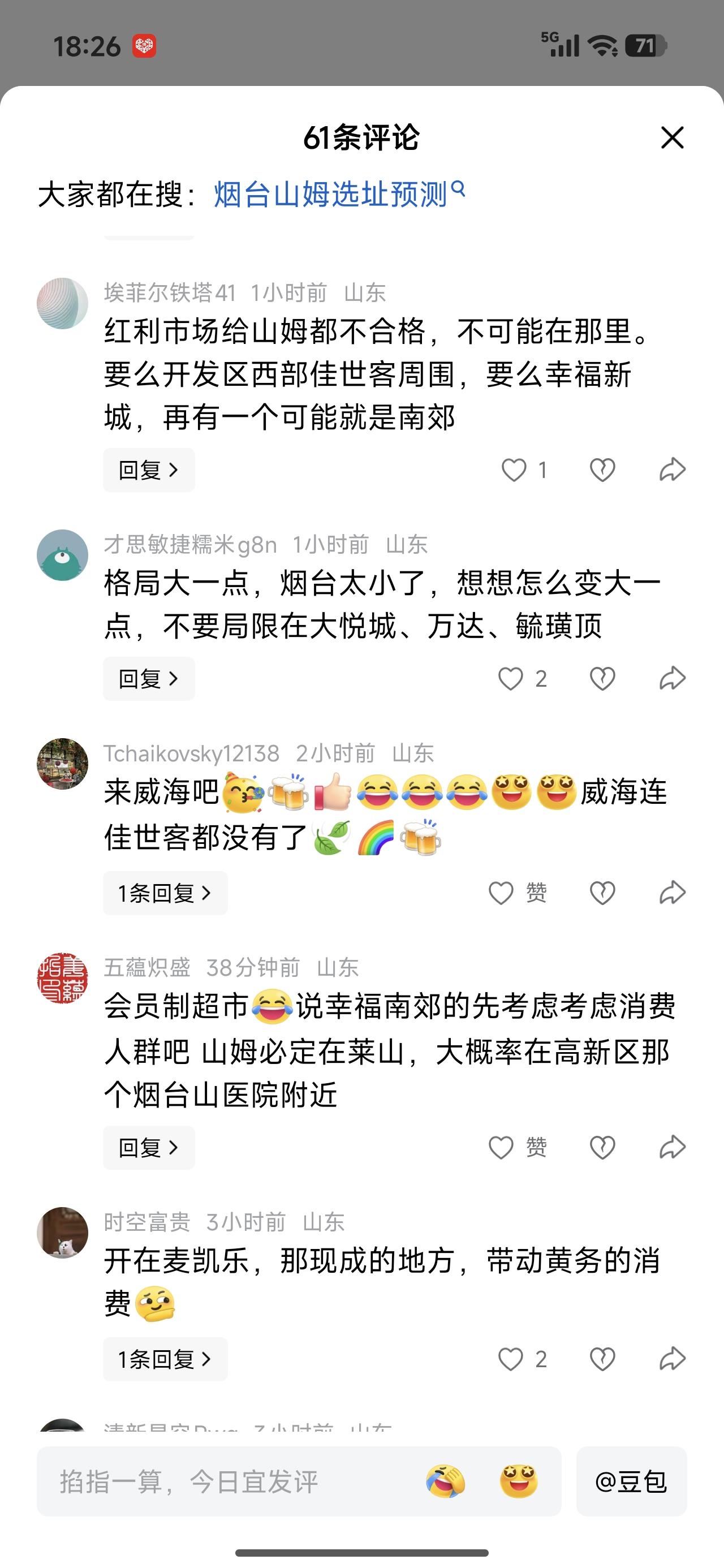 山姆要是真来烟台,能把他安顿到哪?威海说来威海吧。佳世客都没有。小日本的超市有什么好逛的,早苗那么嚣张,不给她挣钱。 山姆的东西我吃过,好大一包一包的,兜里只有一百块不能进去逛。买不上两包东西,钱没了。 我现在吃东西越来越少,吃不动。大包的不适合我这样的人。但东西是不错。吃过的几样儿,都挺好吃的。 没地方就去乡镇开去吧,地方有的是。还能带动一下发展,比如,大辛店之类的。