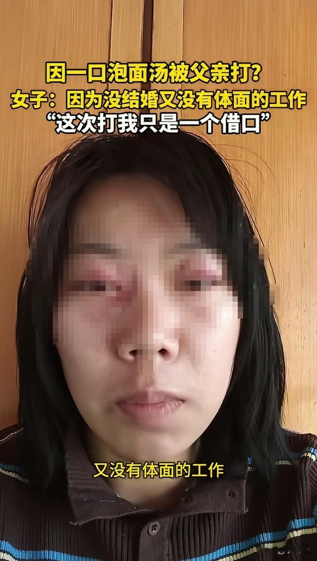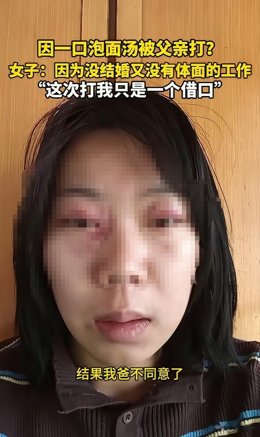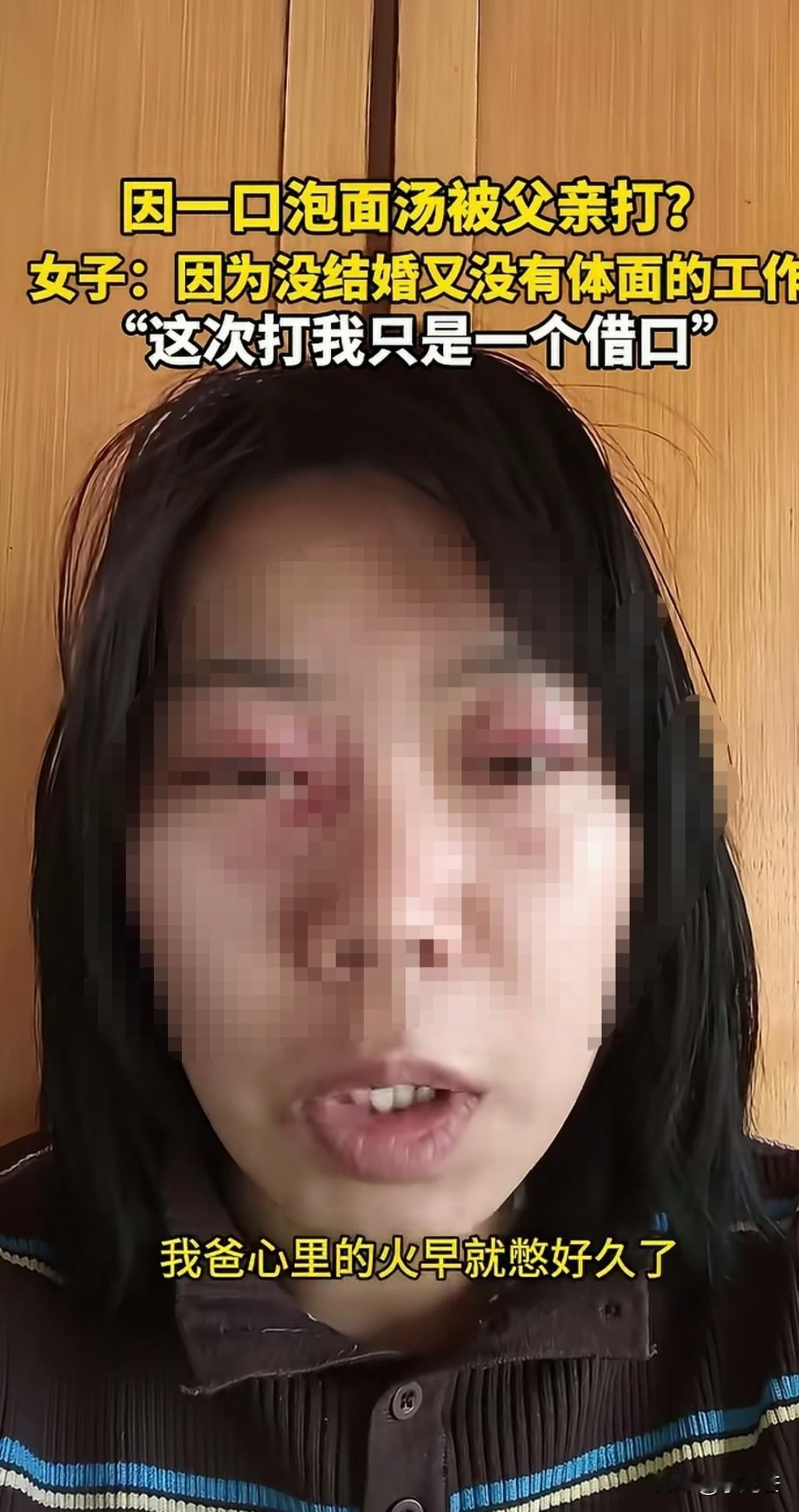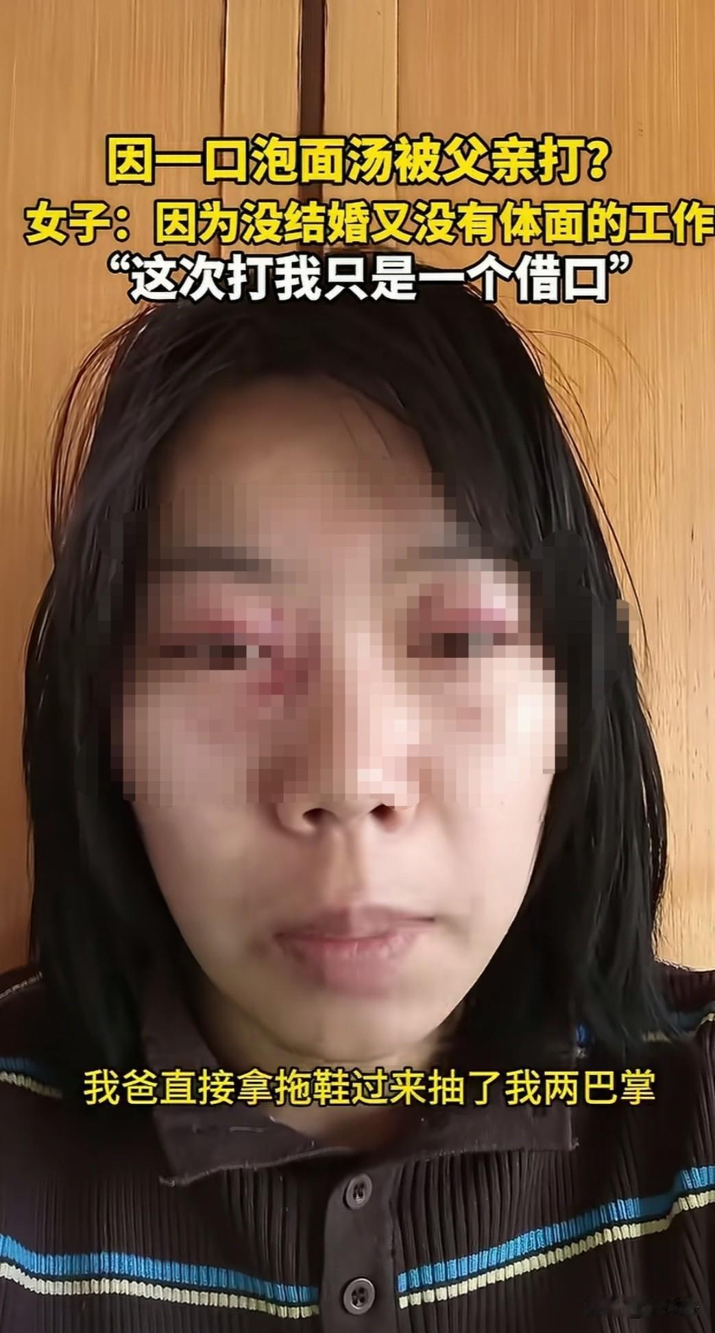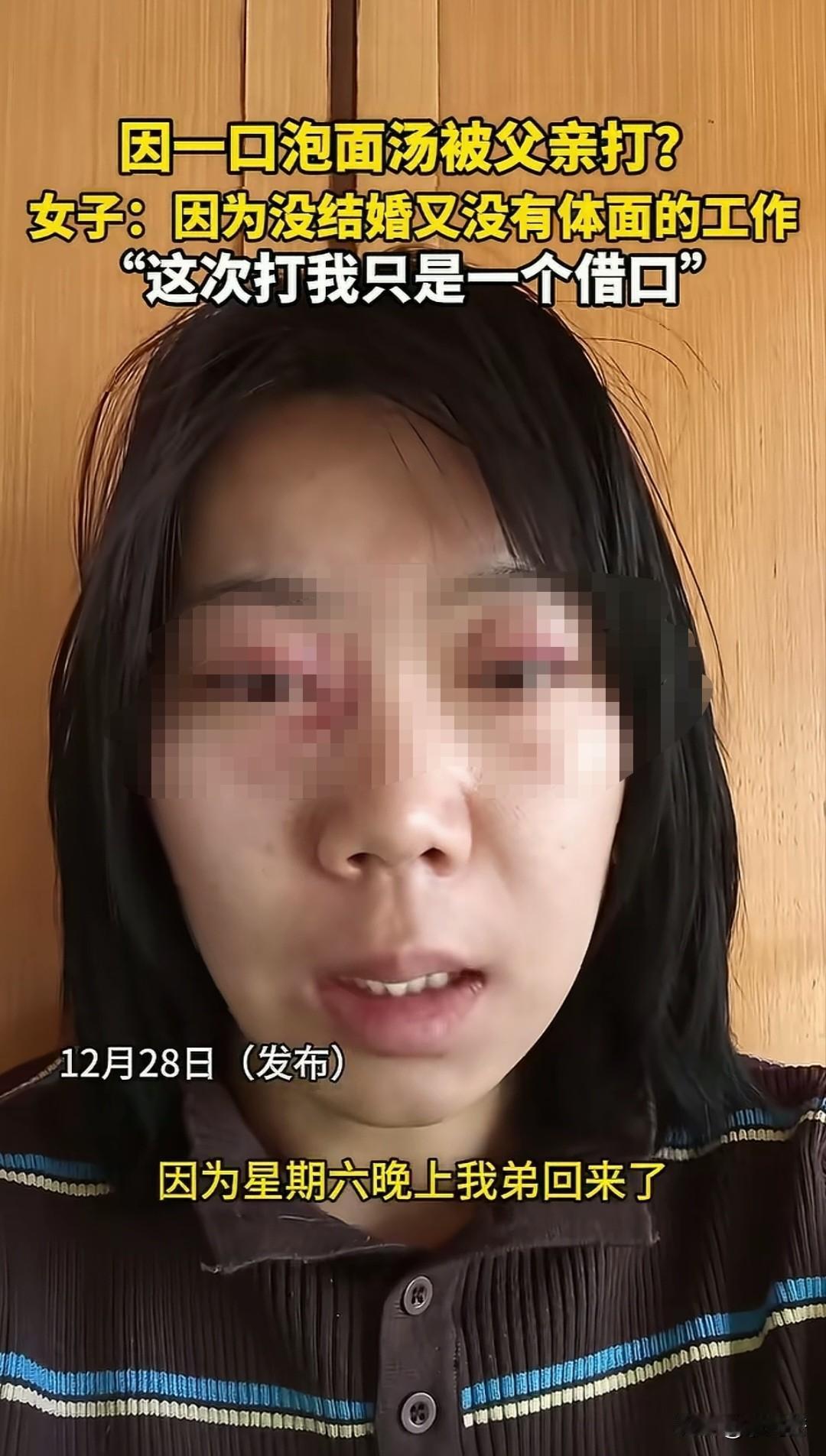 因为喝一口泡面汤被父亲打的鼻青脸肿,到底该不该?女子说周六晚上弟弟回家泡了泡面吃,然后女子说一句“给我留口泡面汤喝”,弟弟也答应了。本以为就是一件寻常的小事,不料引燃了父亲的导火索,父亲对着女儿破口大骂,甚至拿起拖鞋狠狠的抽了两下。 女子被打懵逼,愤怒的瞪着父亲。父亲又直接把她拖到地上打,女子说早就知道父亲看不上我,这次只是一个发泄的借口。 女子在世俗的眼光已经无法容身,自己是不婚主义,不结婚,也没有体面的工作,收入也不稳定,父亲早就窝了一肚子火,这次也只是一个借口。 有人说父亲生气的点是哀其不争,怒其不幸,明明已经那么大人,却还要像小孩子一样要一口泡面汤,一点都不像大人的样子。 明明同龄的孩子要么结婚生子,要么事业顺利,而自己的女儿却只能缩在家里,不思进取懒惰的样子让人越看越生气。 女儿觉得自己没有错,现在人结婚不幸福的那么多,不结婚的也很多,自己选择不结婚并没有对不起谁,而父亲却处处看不惯容不下,也对父亲有怨言。 最终女孩被父亲打的脸都肿了,虽然她语气很平淡,但是被至亲之人伤成这样,心里的伤疤恐怕难以愈合。 有网友说,成年人可以不婚不育,但一定要有独立生活的勇气和实力,只有你能对抗住生活的压力,才会顶住世俗的眼光。