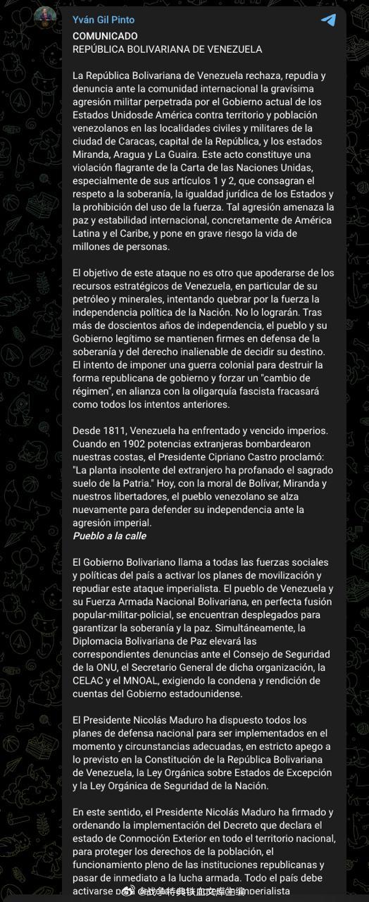 委美冲突 马杜罗签署紧急状态令,应对美国对委内瑞拉的袭击▪️委内瑞拉总统下令,鉴于美国的袭击,所有国家防御计划必须立即启动。政府表示:"我们将动用所有防御计划,坚决抵抗帝国主义的侵略。"▪️委内瑞拉外交部称,美国袭击了加拉加斯的民用和军事目标。委内瑞拉武装部队已全面部署,捍卫国家主权。▪️与此同时,美国媒体报道称,这些袭击目标是由特朗普亲自选定的。委内瑞拉首都传来数声爆炸声烽火问鼎计划