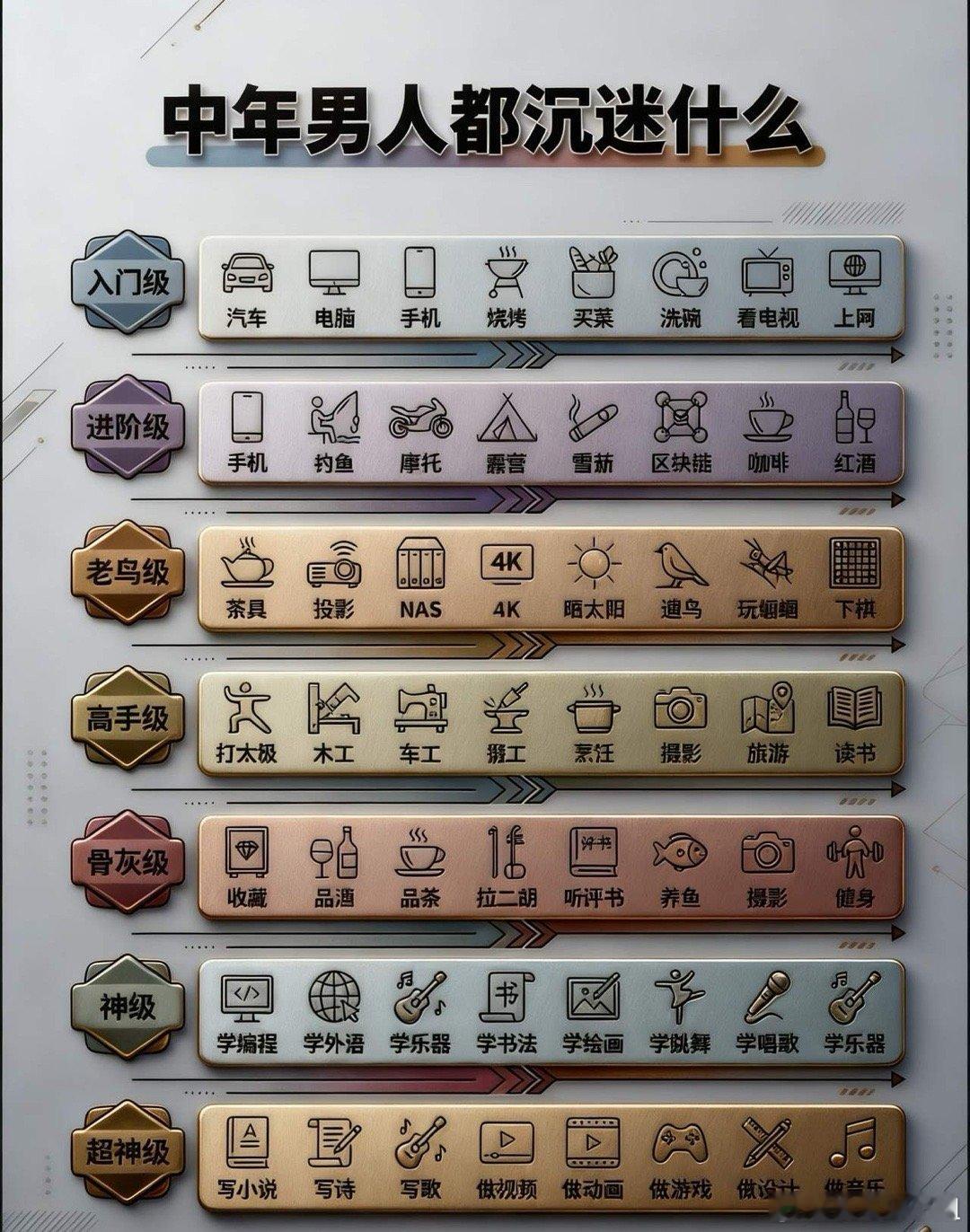 威廉王子夫妇年薪3090万美元中年男人沉迷什么?都不再沉迷女色了?现在主要都沉迷什么(TOP5)1. 钓鱼/户外:独处放空,对抗压力,装备升级有成就感。2. 文玩/茶道:指尖盘玩见岁月,慢仪式感稳情绪。3. 机车/改装:头盔一戴,身份全抛,找回年轻冲劲。4. 健身/养生:对抗衰老,求健康安全感,自律带来掌控感。5. 游戏/短视频:低成本即时反馈,睡前偷来的个人时间。为什么不沉迷“追逐女性”了- 生理:睾酮每年降1%-2%,冲动阈值升高,不是没欲望,是“油门软了”。- 责任过载:房贷、育儿、养老、职场压力,精力优先保生存,浪漫“成本”太高。- 情感转向:从“新鲜感”到“稳定陪伴”,婚姻里更重理解与支持,而非表面吸引。- 自我觉醒:不再靠他人定义价值,转向爱好、健康、创作,追求“精神防空洞”与自我实现。- 关系倦怠:长期缺乏共鸣、单向索取或争吵,情感消耗后转向低内耗的兴趣。真相不是不爱,是爱得更成熟——把“讨好别人”换成“讨好自己”,在角色之外,留住“自己”的少年感。中年男人喜好中年男子的通病