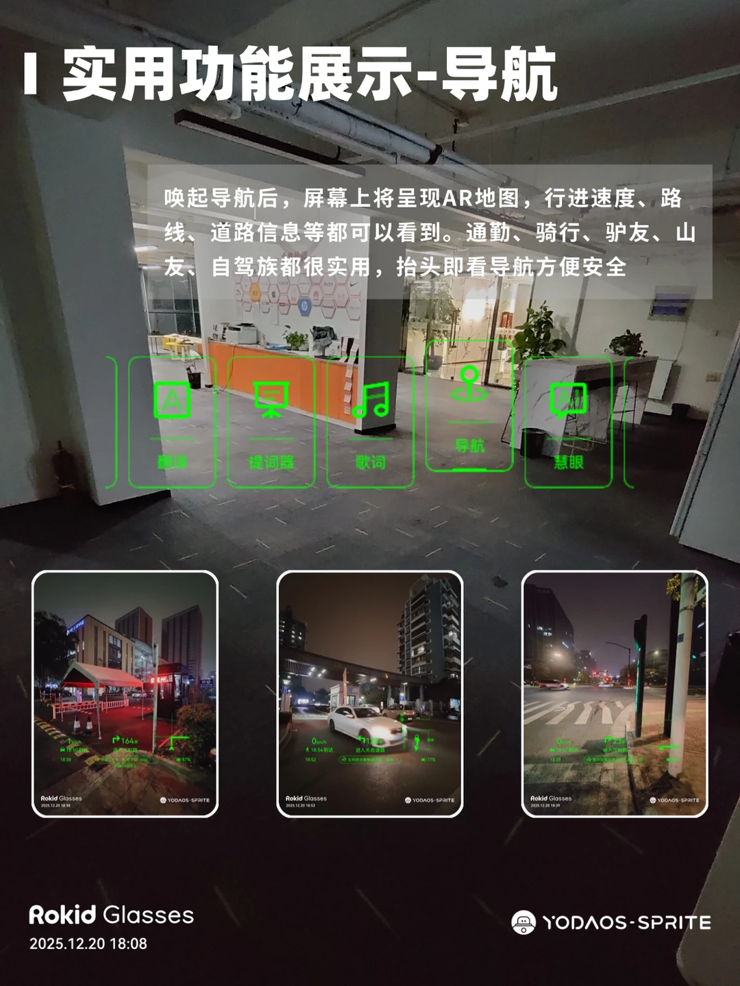唤起导航后,屏幕上将呈现AR地图,行进速度、路线、道路信息等都可以看到。通勤、骑行、驴友、山友、自驾族都很实用,抬头即看导航方便安全