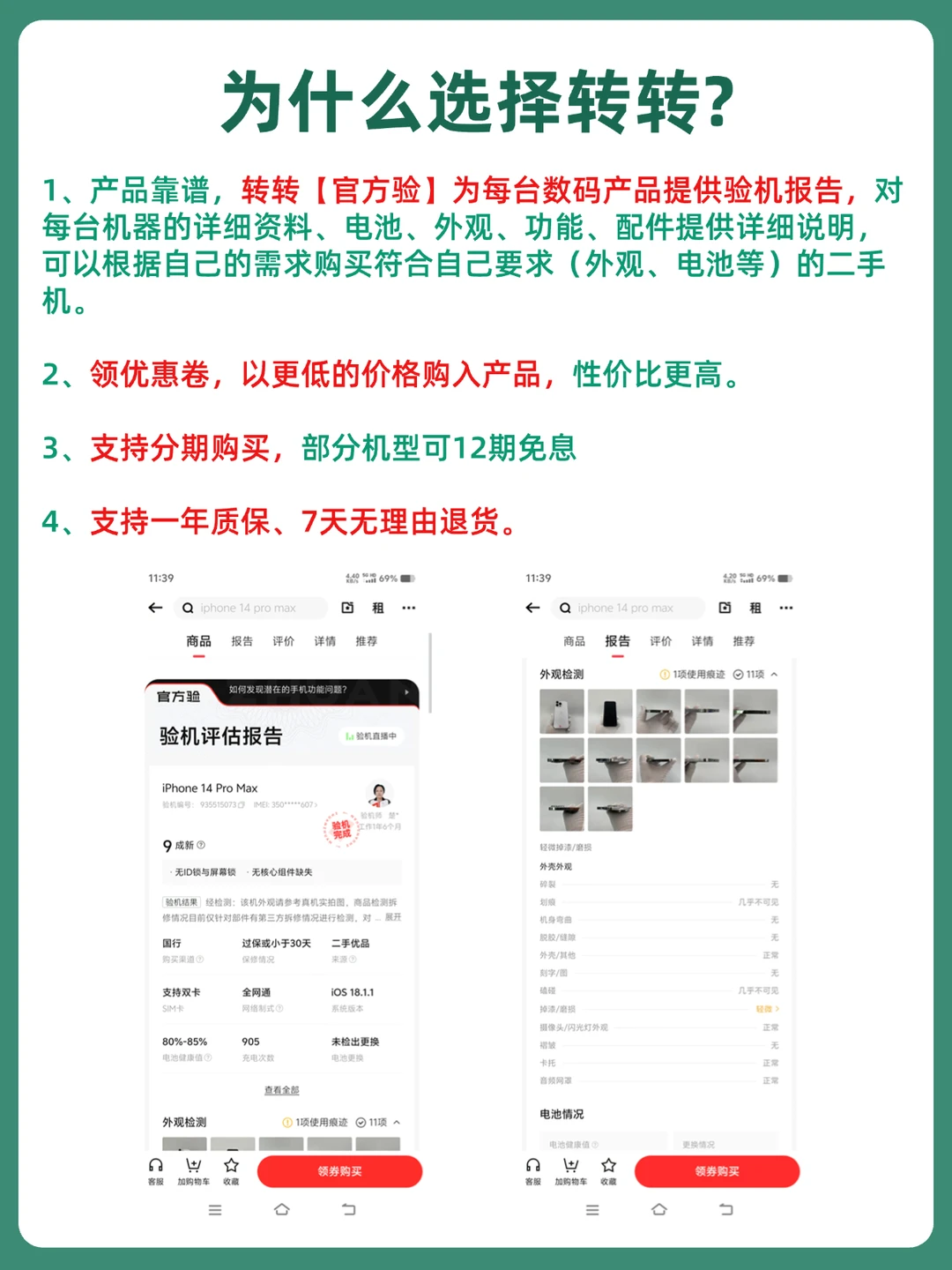 推荐去转转!首先转转是一个专业做二手数码的平台,产品靠谱有保障,每台数码产品都会提供验机报告,对电池、外观、功能、配件等进行详细的检测,不用担心有故意以次充好之类的坏机,报告上面有什么问题都交代的清清楚楚,并且支持一年质保和7天无理由退货,有问题随时可以退!