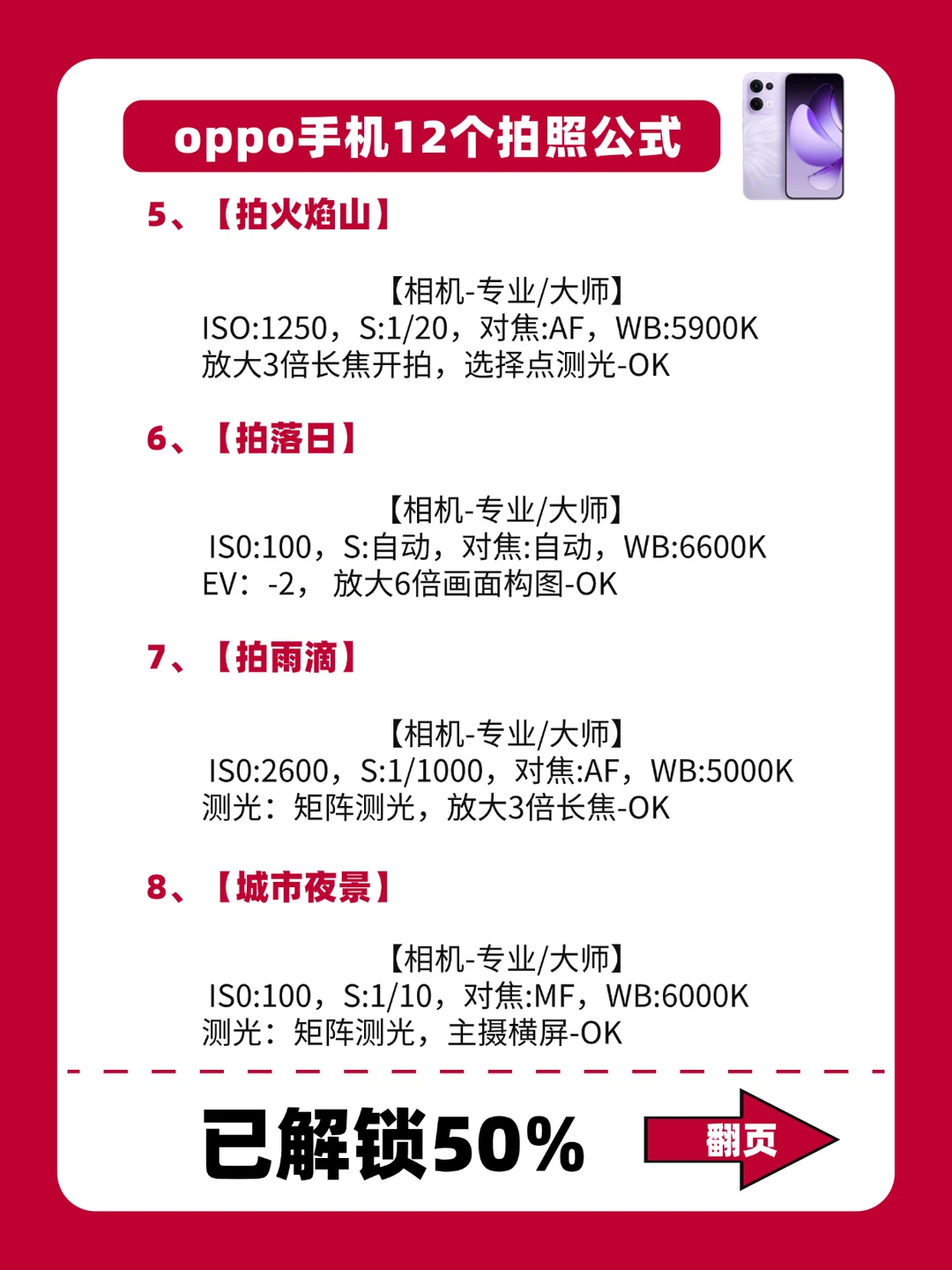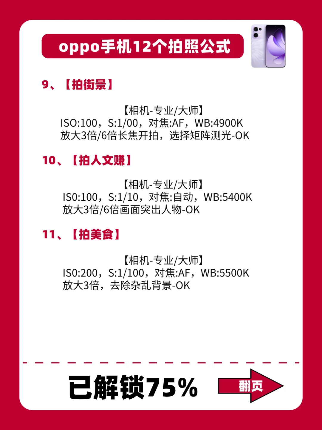 - 嗨~姐妹! 今天给大家分享12个oppo拍照公式,拍照前调整参数,秒变专业摄影大师!! 这12个拍照公式,尤其是街道和日落的参数,赶紧收c起来,别用到时候找不到啦!! 希望每个姐妹都可以学会oppo手机专业模式,巨牛!! -