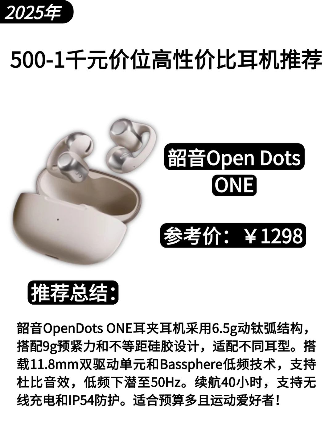 韶音OpenDots ONE耳夹耳机采用6.5g动钛弧结构,搭配9g预紧力和不等距硅胶设计,适配不同耳型。搭载11.8mm双驱动单元和Bassphere低频技术,支持杜比音效,低频下潜至50HZ。续航40小时,支持无线充电和IP54防护。适合预算多且运动爱好者!