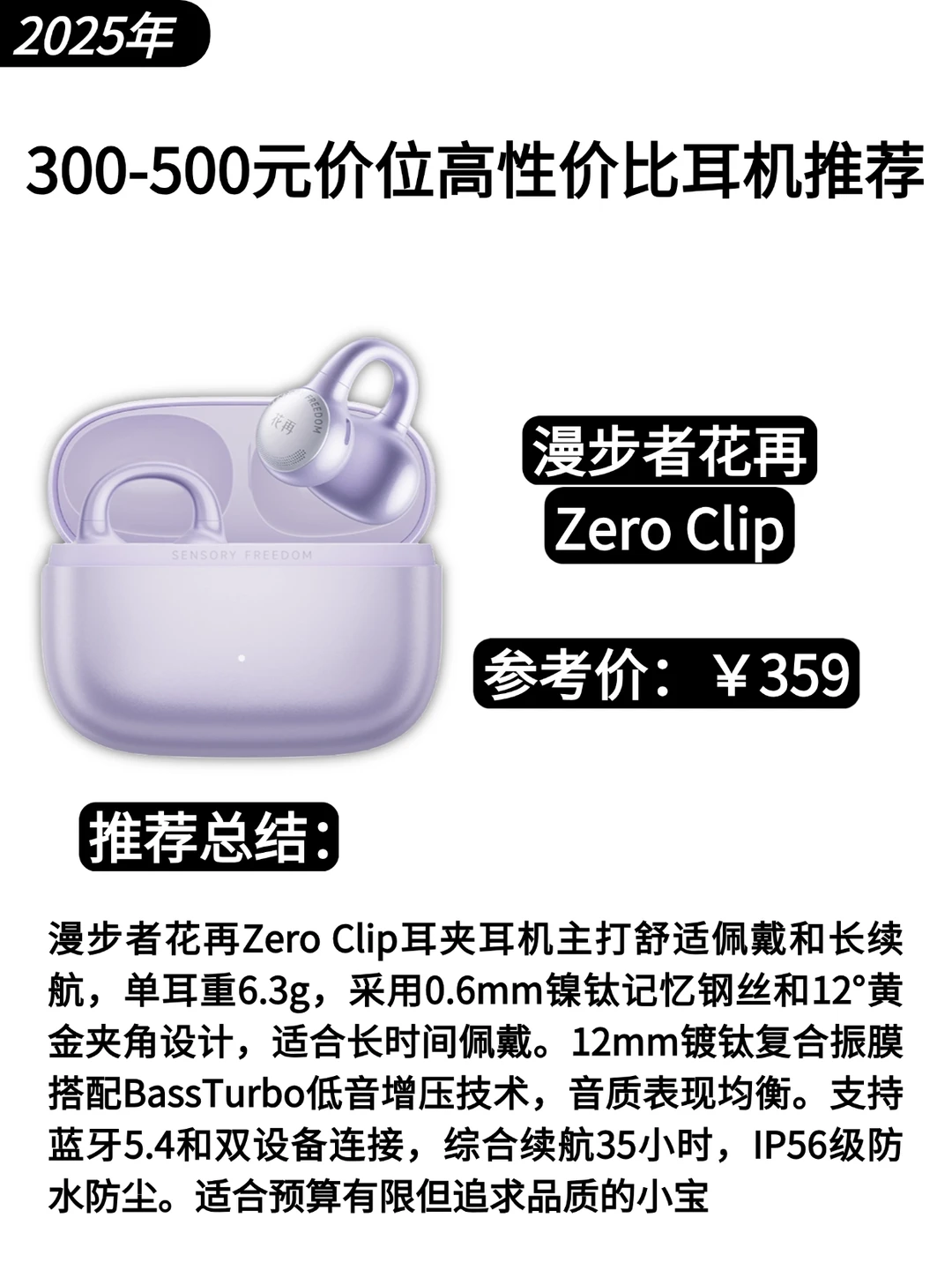 漫步者花再Zero Clip耳夹耳机主打舒适佩戴和长续航,单耳重6.3g,采用0.6mm镍钛记忆钢丝和12°黄金夹角设计,适合长时间佩戴。12mm镀钛复合振膜搭配BassTurbo低音增压技术,音质表现均衡。支持蓝牙5.4和双设备连接,综合续航35小时,IP56级防水防尘。适合预算有限但追求品质的小宝!